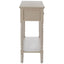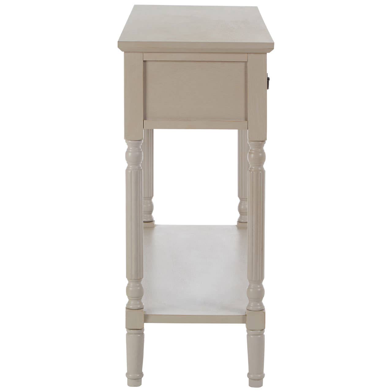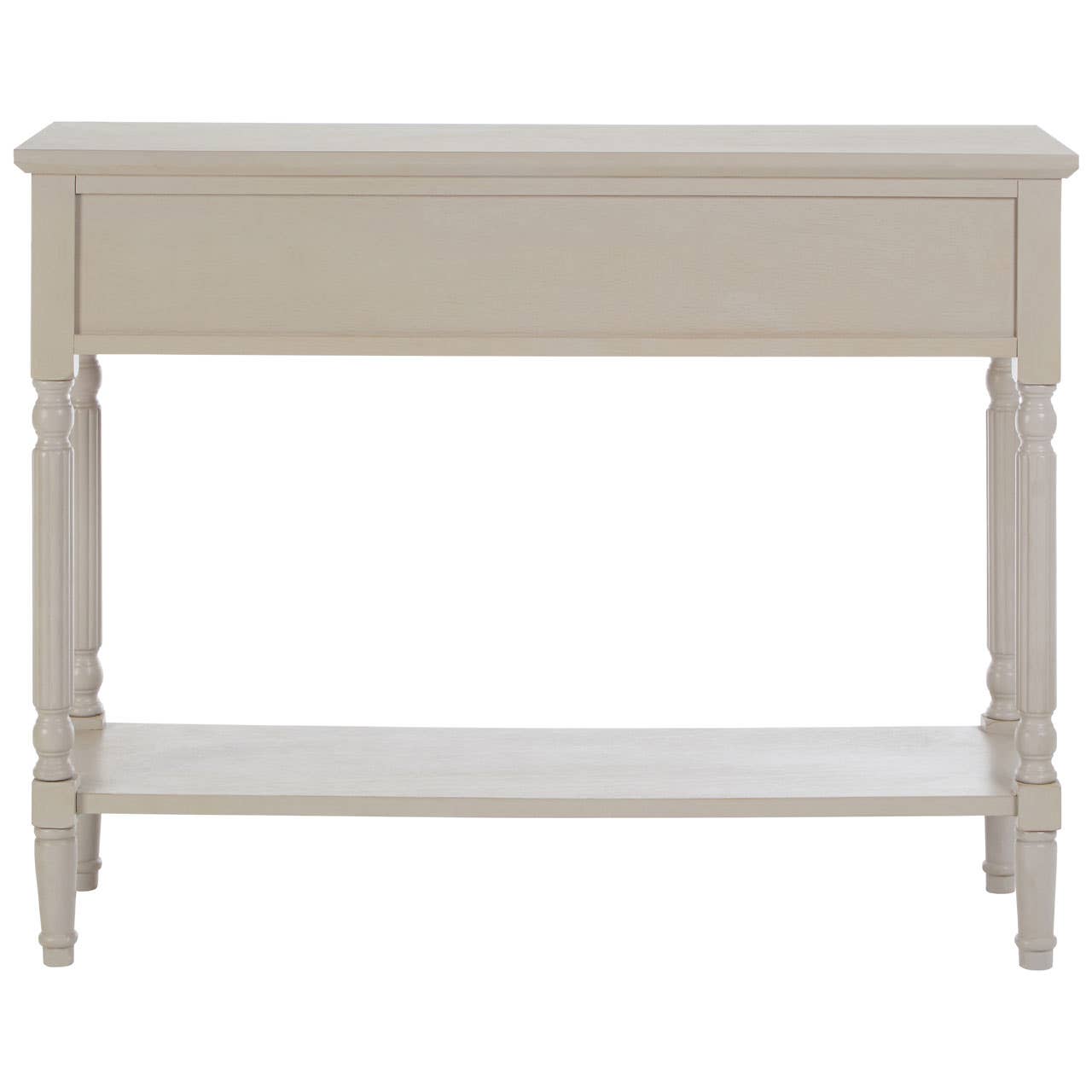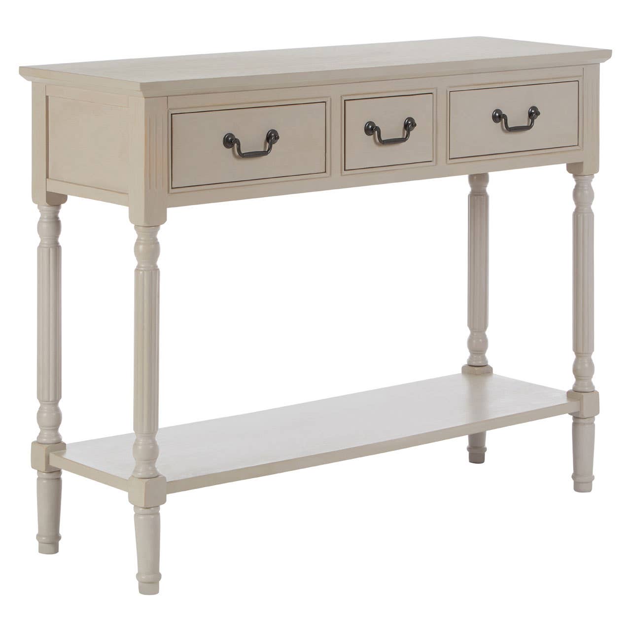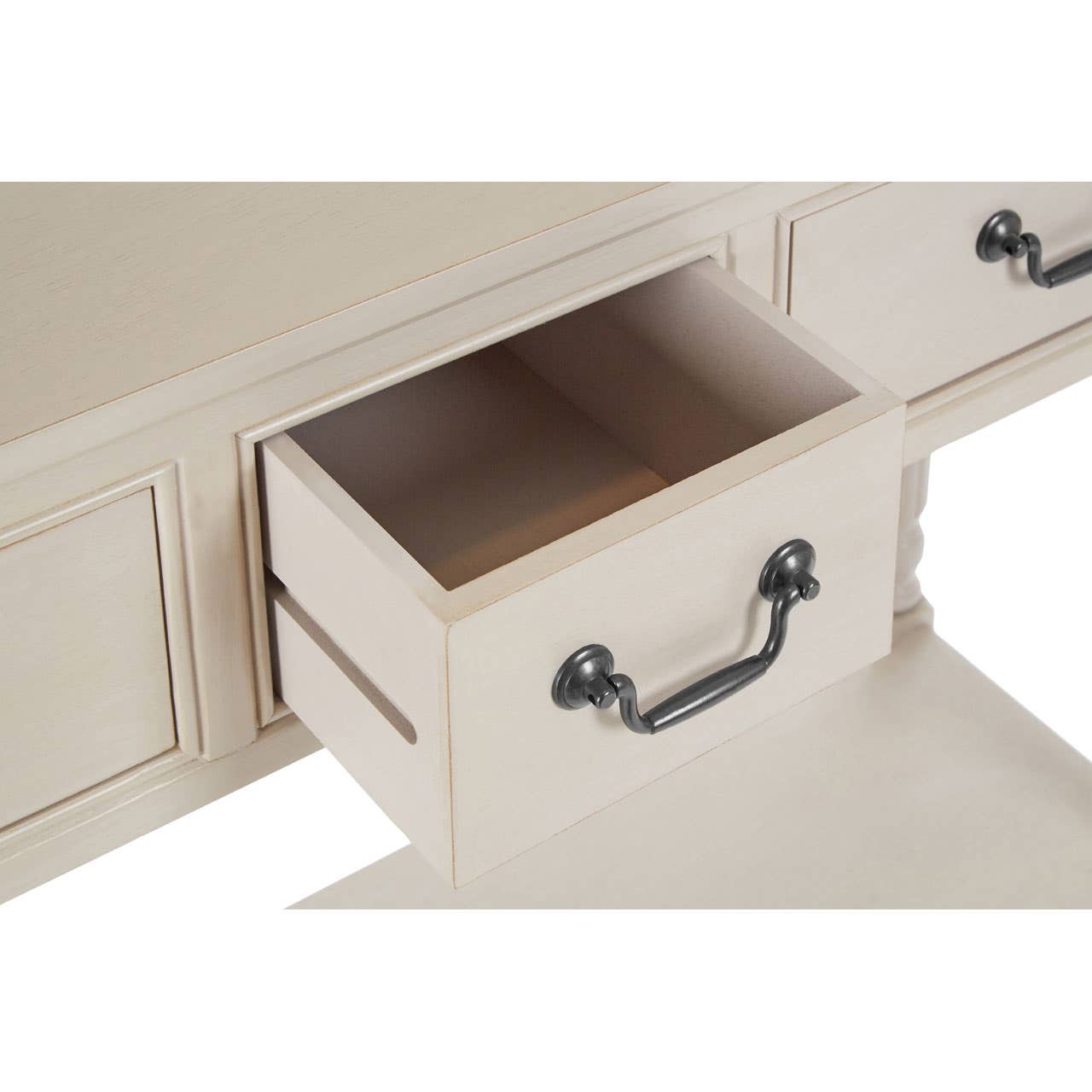 Its pillared and knopped legs coordinate with the carved cabinet to create a classical, rustic style. Made from natural Chinese oak, the table's vintage grey finish accentuates its traditional look. Its three drawers feature elegant metal handles, while a lower shelf provides additional storage and display space.