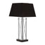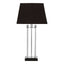 Its square granite base is coloured black to contrast with the reflective silver finish stainless steel body. A black fabric shade diffuses light gently.