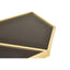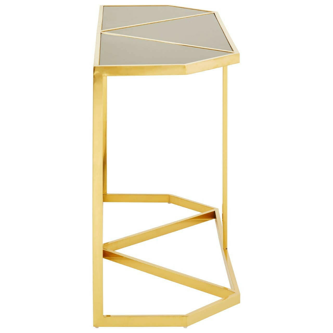 Gold finish stainless steel travels across the sleek black tempered glass top. The matching gold finish steel base creates a sense of fluidity with the top. Style it with luxe-inspired furniture and accessories.
