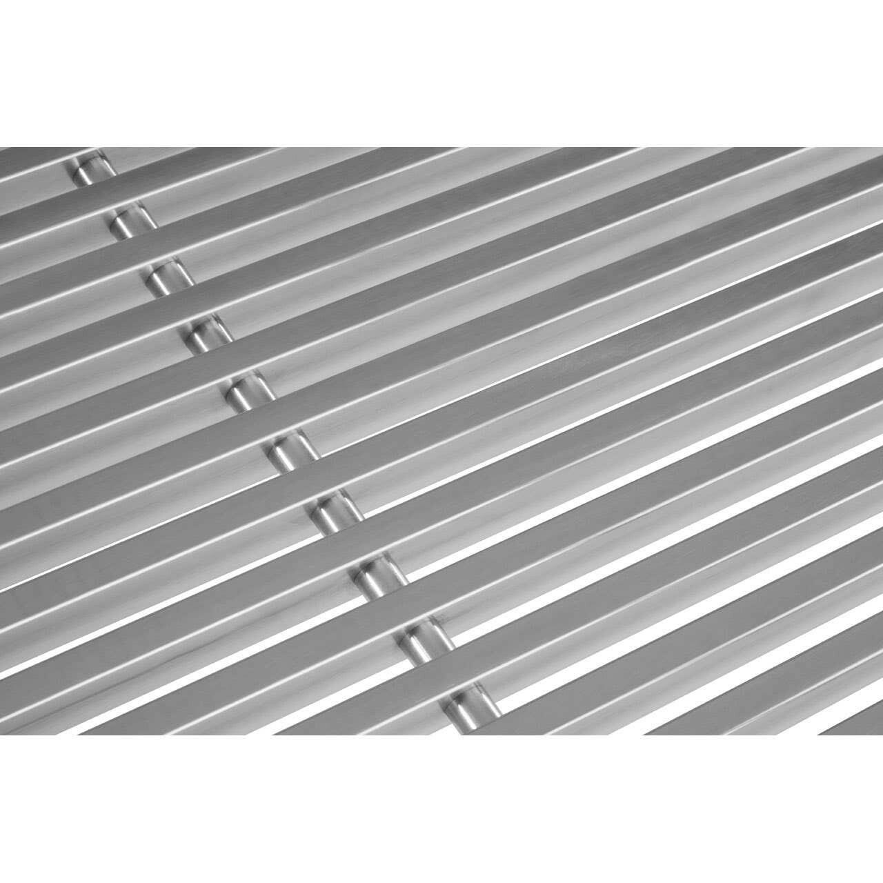 Formed into a rectangular shape, this coffee table features a brushed stainless steel construction finished in a reflective silver coloured coating. The linear detailing gives it a symmetrical, aesthetically pleasing look and lends it a distinctive edge. The smoothly moulded edges add to its understated industrial looks.