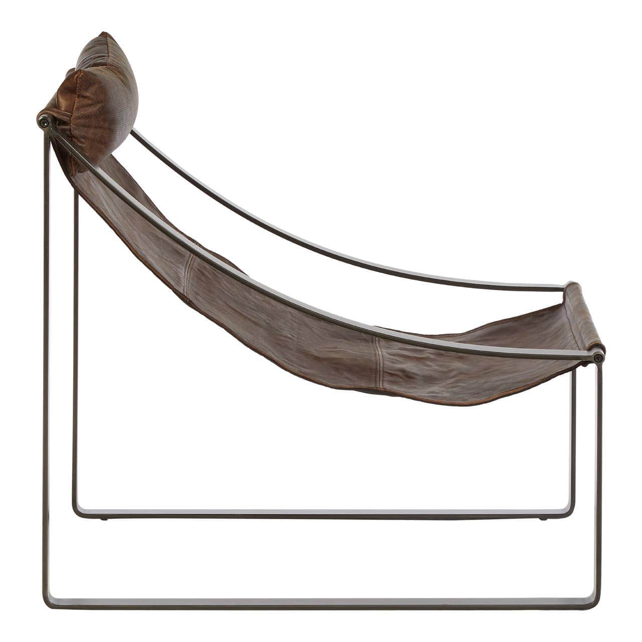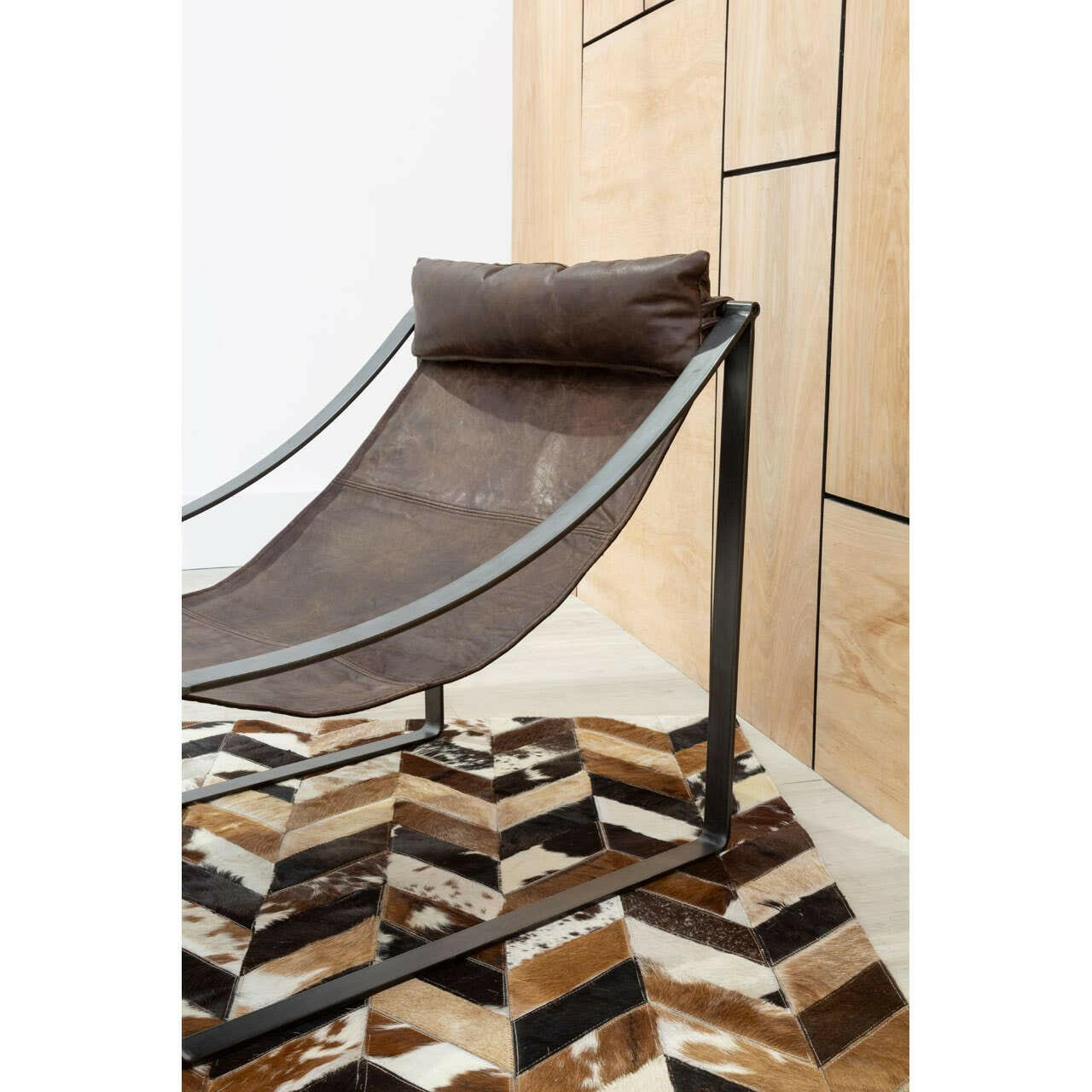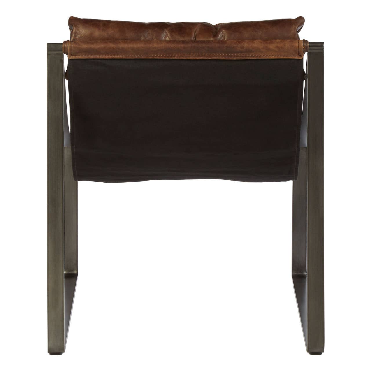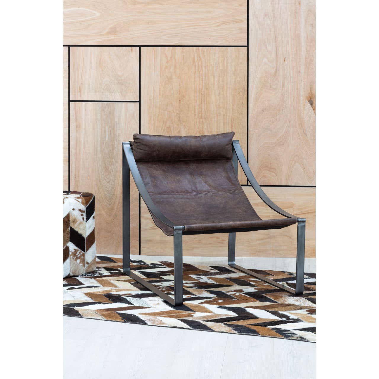Exhibiting distressed brown leather neatly stitched on a sleek iron frame, this accent chair adds visual interest to the room. Supported by a sturdy sledge base, this chair is complete by a headrest upholstered with foam to provide optimum comfort.