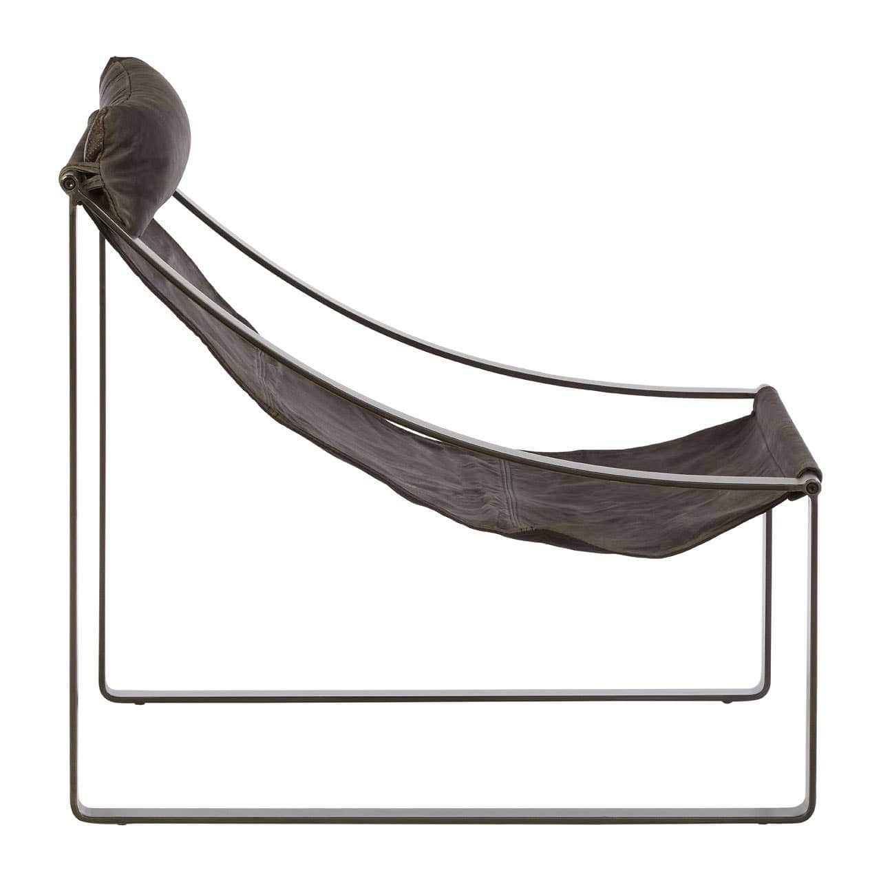 Exhibiting distressed ebony leather neatly stitched on a sleek iron frame, this accent chair adds visual interest to the room. Supported by a sturdy sledge base, this chair is complete by a headrest upholstered with foam to provide optimum comfort.