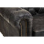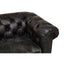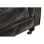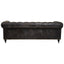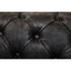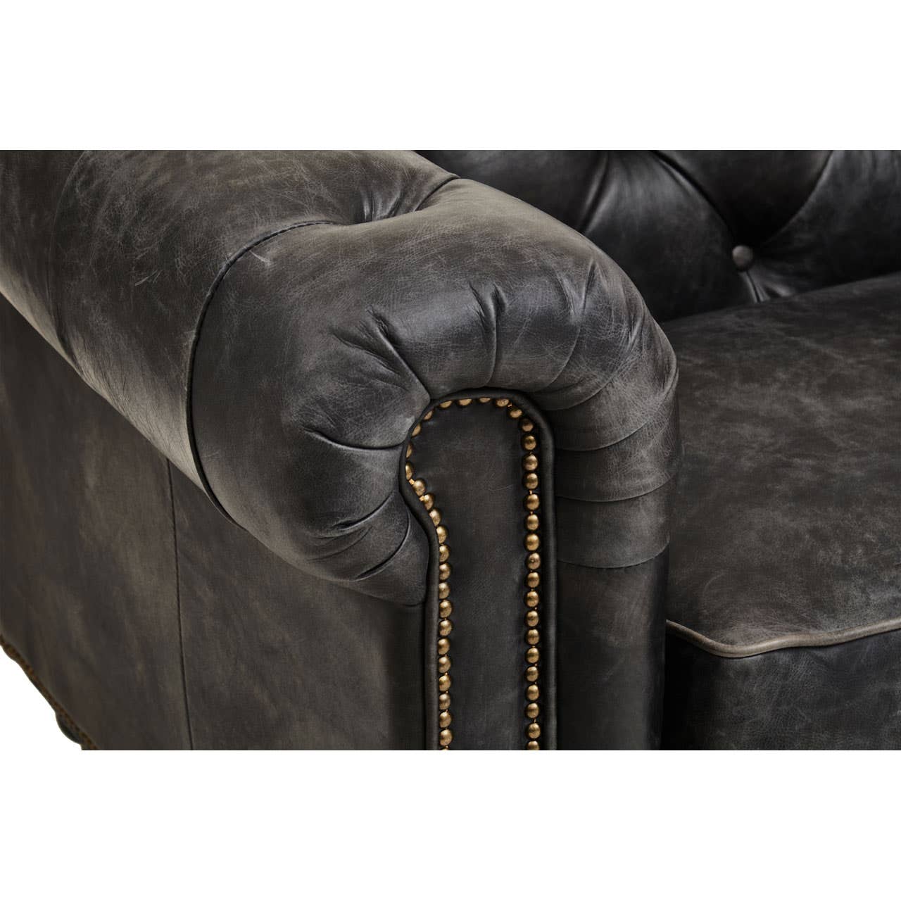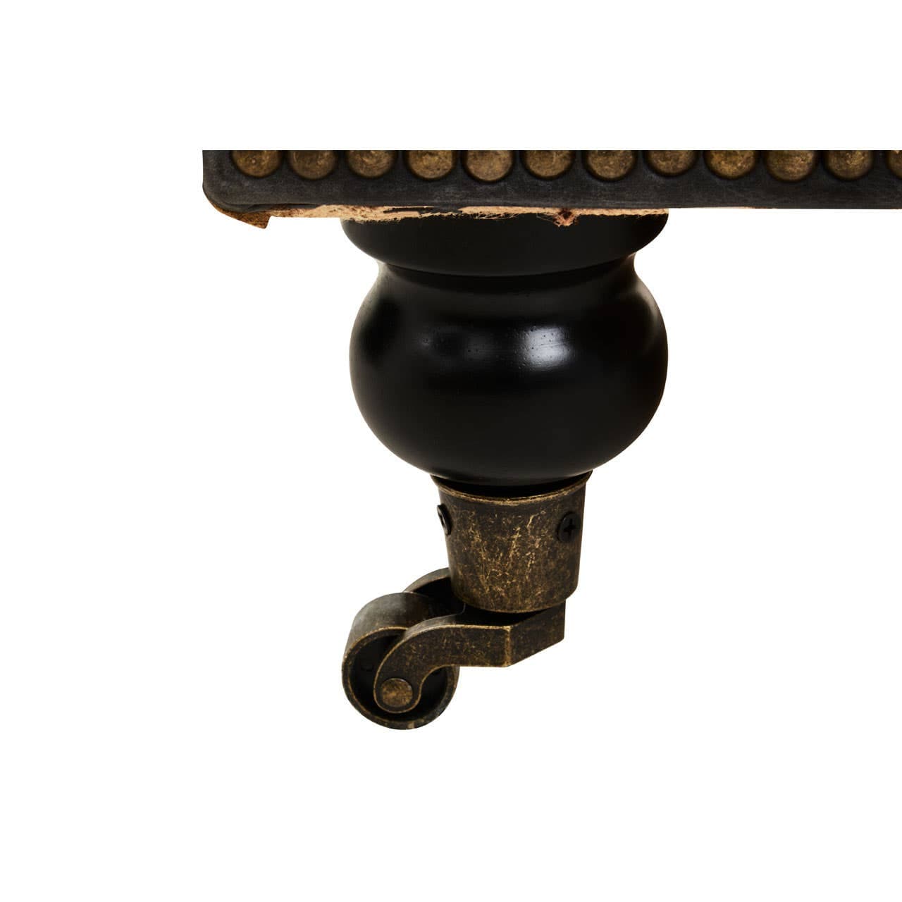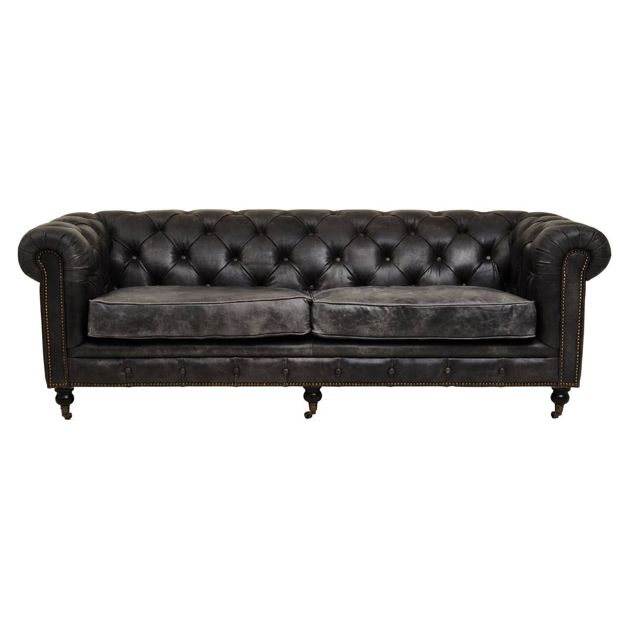 Upholstered in ebony leather, this three seat sofa in deep buttoning creates a traditional chesterfield aesthetic. The foam filled seat and back cushions provide premium comfort. Rolled arms and turned feet with castor wheels contribute to vintage look.