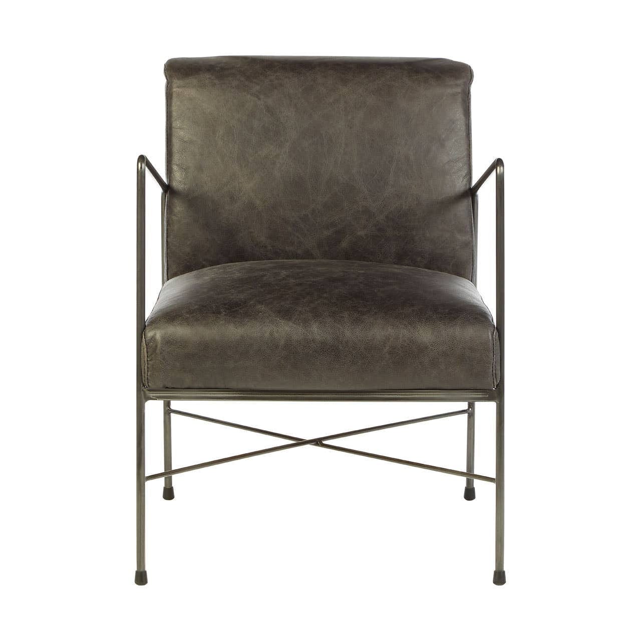 The Hoxton lounge chair minimal frame is made from slender cylinders of dark iron, lending it a soft industrial edge. Two overlapping strips of iron create a cross effect, joining the four legs at their mid-point.