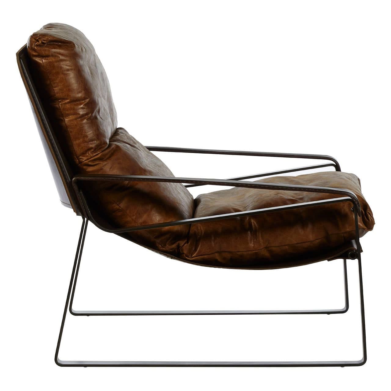 Genuine light brown leather trims adorn the Hoxton lounge chair's armrests and back, with striking lighter stitching adding a tonal contrast. The soft cushioned backrest and seat are also upholstered in genuine leather, its prominent distressing enhancing the factory-floor aesthetic. Coordinate with natural wood and cool metallic accents.