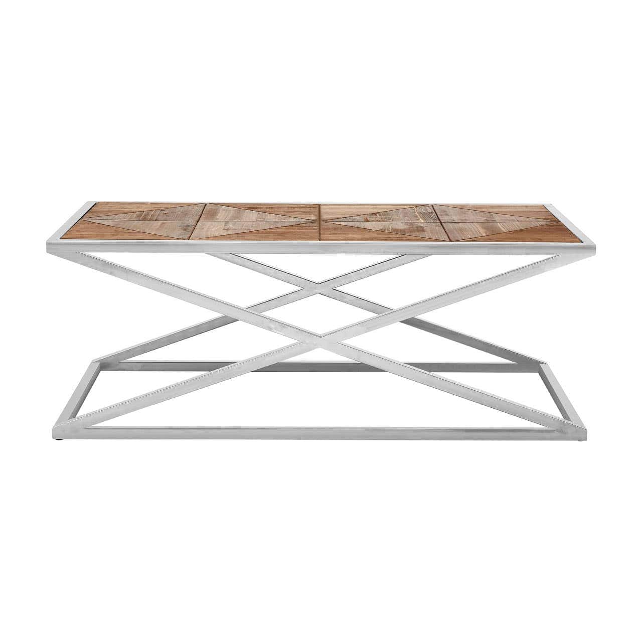 A wonderful feature in the centre of your room, the Hudson coffee table combines contemporary chrome with traditional wood for a functional and fashionable furniture piece in your living space. The criss cross stainless steel frame, with square base, gives a minimalistic and chic look, while ensuring stability and sturdiness. Their gleaming finish further accentuates a trendy look which contrasts the two tone wooden top, creating an eye-catching piece. Made from MDF and featuring a fir wood veneer, the groove design and worn look gives the table some rustic appeal. Ideal for displaying plants, photos, flowers and other ornaments, you can make your home your own. Complementing most decors, the Hudson side table will bring style and practicality to your home. *This item has a distressed look, imperfections in the wood and metal are part of the design*