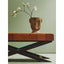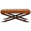 This bench has a button tufted seat upholstered in brown genuine leather. The rectangular seat in dense form padding matches the smooth warm brown cedar wood frame forming an elegant cross base.