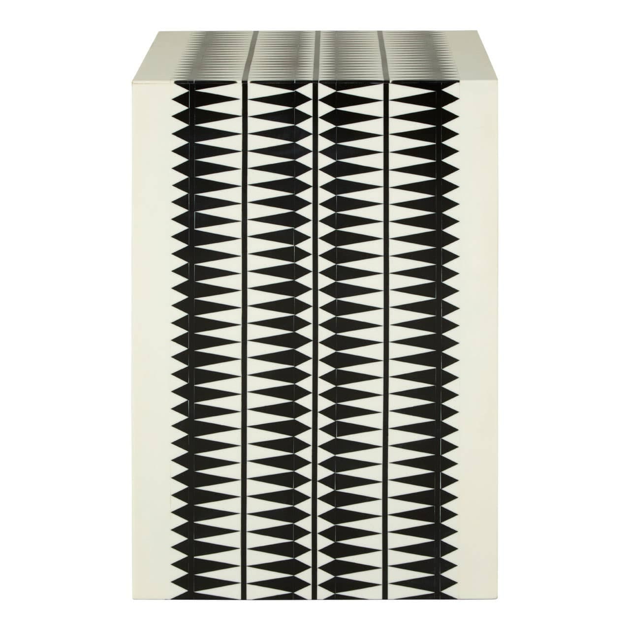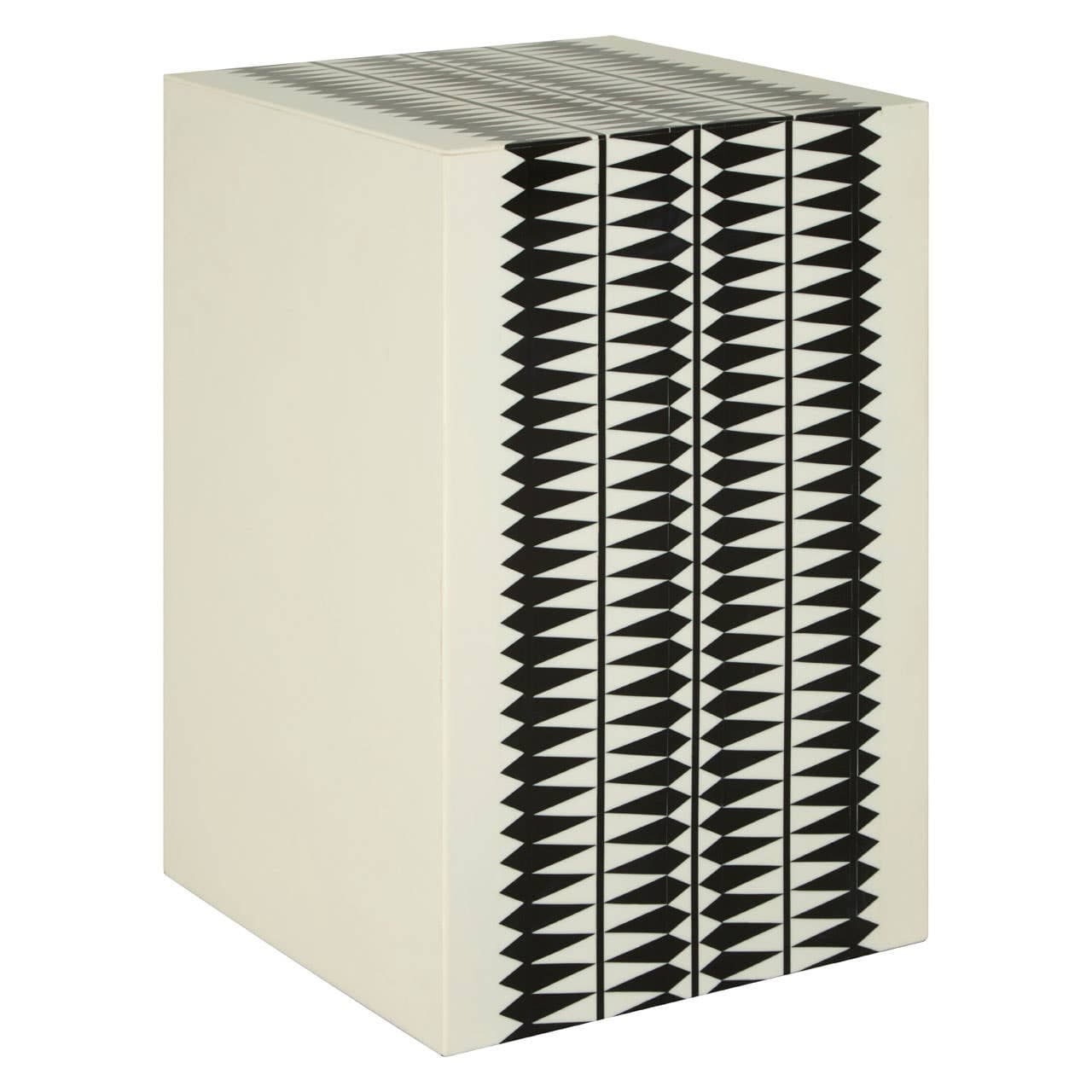 The stool has a crisp white base colour that offers a clear canvas for the regular black patterning. The enamel makes it a tactile addition to the living room.