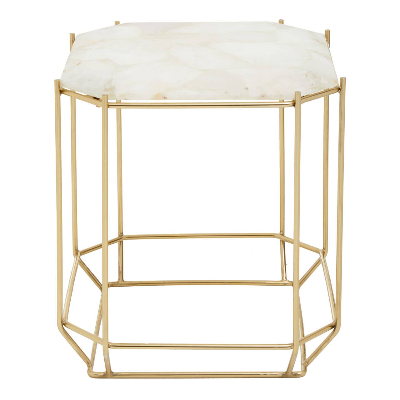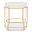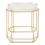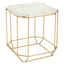 This side table boasts a sleek and slim profile that creates a luxe accent to a variety of furniture styles. Topped with white quartz in an octagonal shape, the tabletop is supported by an open-frame angular metal base in a warm metallic finish.