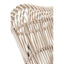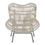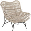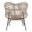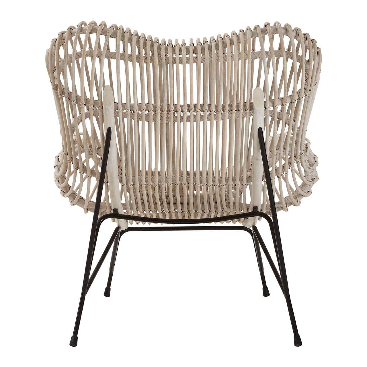 An expression of hygge aesthetic, this chair weaves sustainable white rattan into a distinctive cage structure. A black iron frame supports the seat, its legs creating a low profile. Slim lateral lines are supported by thicker horizontal partners, each point held secure by cross lacing. Its rounded fore section creates a sunken seating area, with a pinched headrest that adds to its poise.