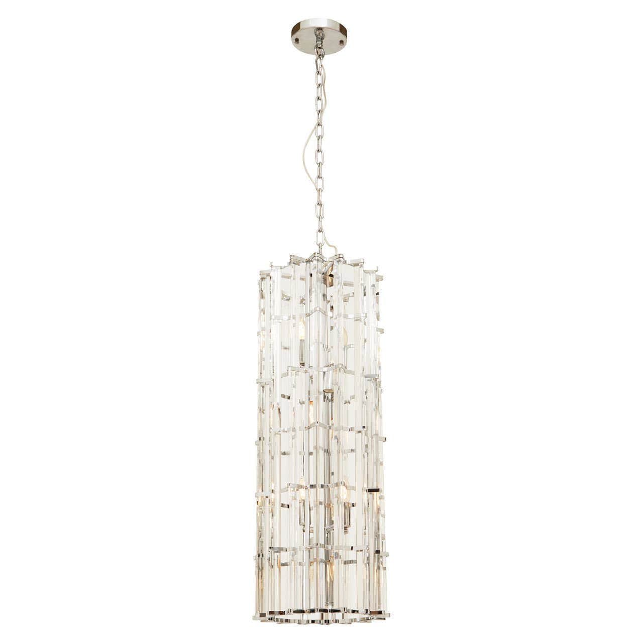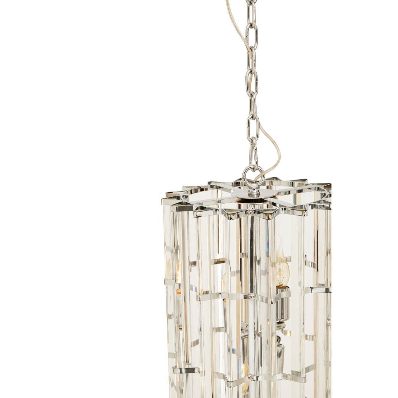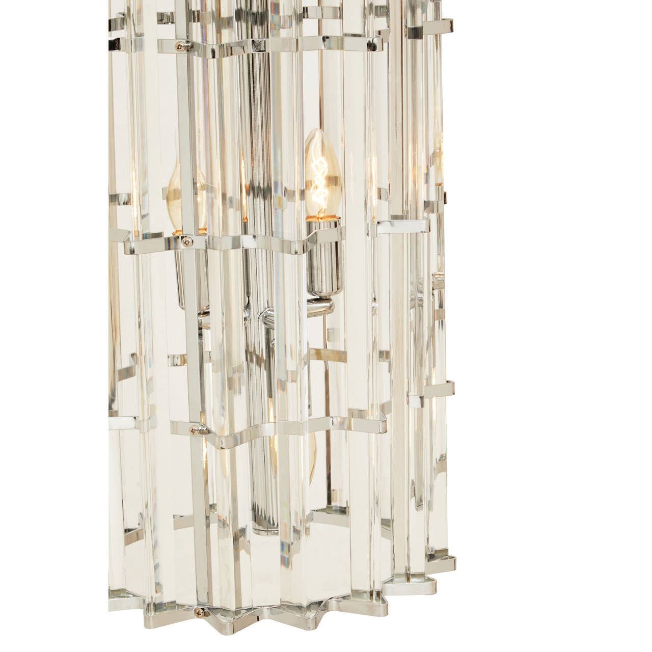 Surrounded by crystal accent prisms respectively and geometrically arranged in a vertical glass frame refracting the light in multiple directions, emitting classy aura. Crystal spheres shimmer like dewdrops in brass finished iron grid with eight bulbs.