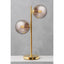 Defined style with a practical design brings cosmopolitan sophistication complimenting sleek decor. The smooth sturdy base anchors gold finished straight tubing with two silver spherical glass shades. The lamp's broad and sturdy base prevents tipping off.