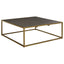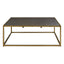 The table has a low profile and unfussy silhouette, featuring a square iron frame that sports a deep gold finish. Its top is covered with textured shagreen which has a dark brown colour that pairs naturally with the gold.