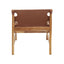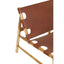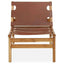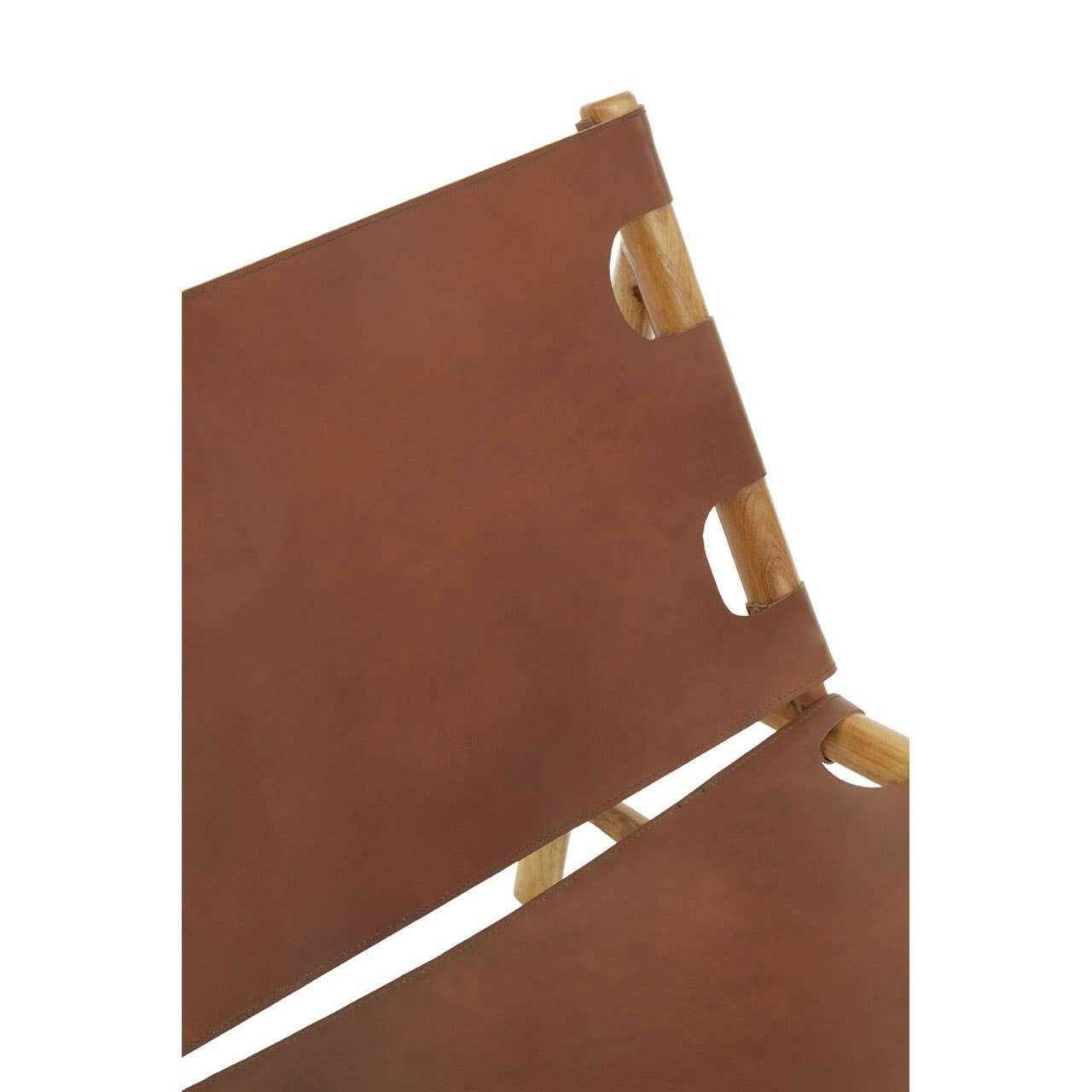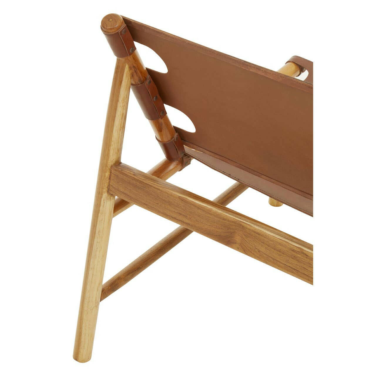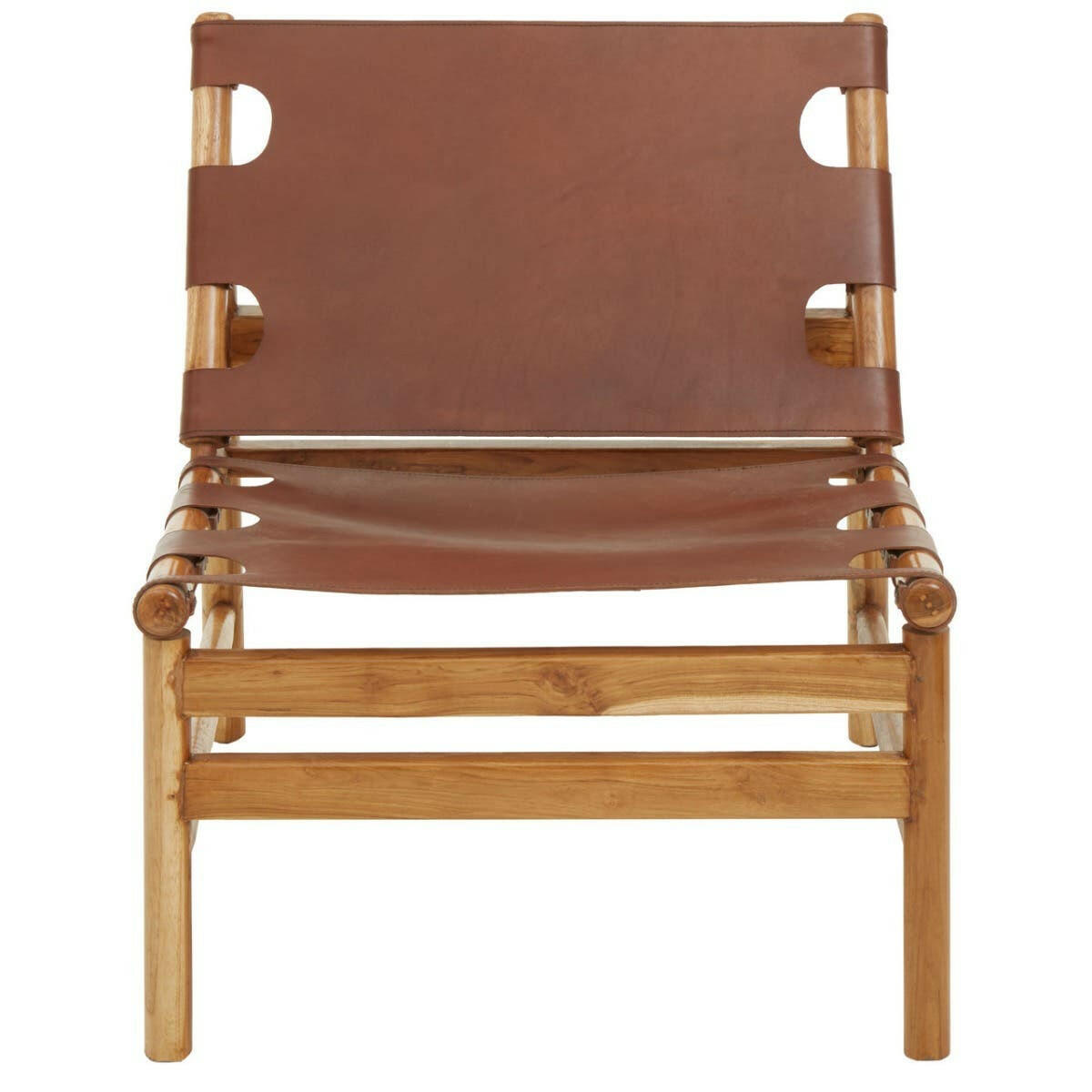 The laid-back brown leather seat and back of this chair form a sling design that is wrapped gently around an angular teak wood frame. The clean line design contributes to the minimal aesthetics of this chair, while the sturdy wooden base provides support.
