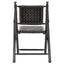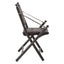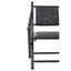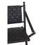 The Kendari chair exhibits handwoven black leather straps that are wrapped around a black teak wood frame. This chair adds texture and a subtle metallic accent.
