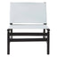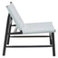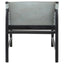This chair has a frame crafted from solid teak wood and has a sleek black finish. Its relatively large footprint allows the backrest to be positioned at an angle, ensuring a relaxed sitting experience. Soft leather is stretched across the seat and backrest and is coloured grey to coordinate with the wood.