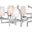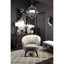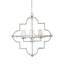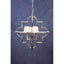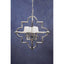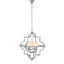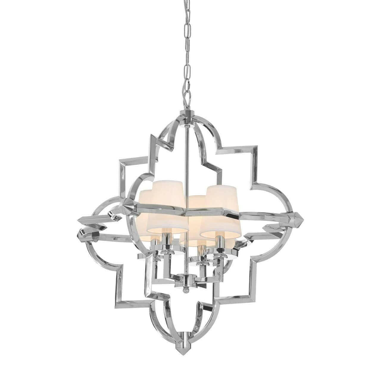 This distinctive light is suspended from the ceiling by a strong iron chain. With its combination of straight and rounded lines the chrome finish iron frame creates a Moorish vibe, ideal for adding an exotic touch to a boutique hotel style interior. Four lamps are situated at the centre of the light, each one boasting a neutral coloured fabric shade.