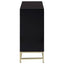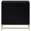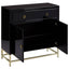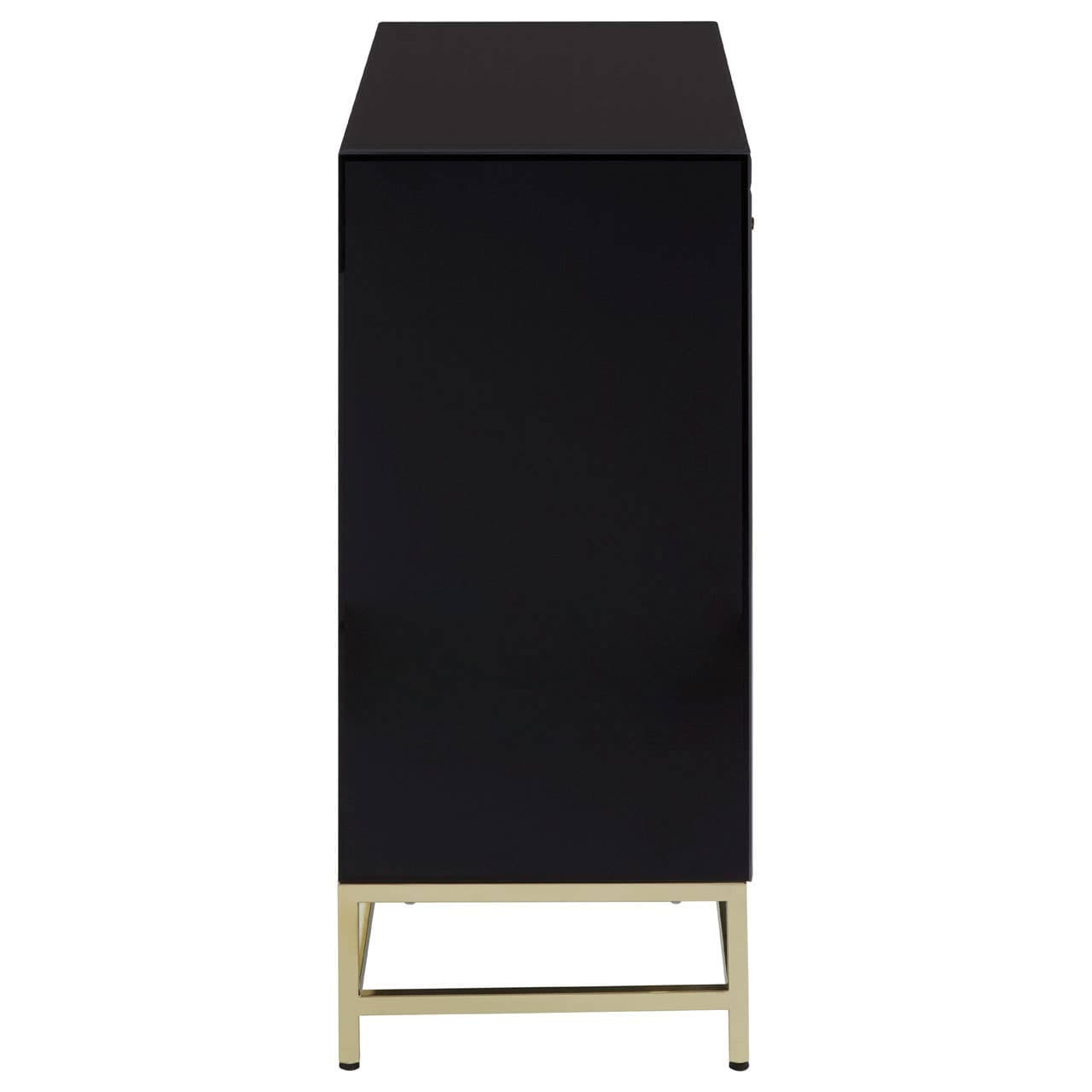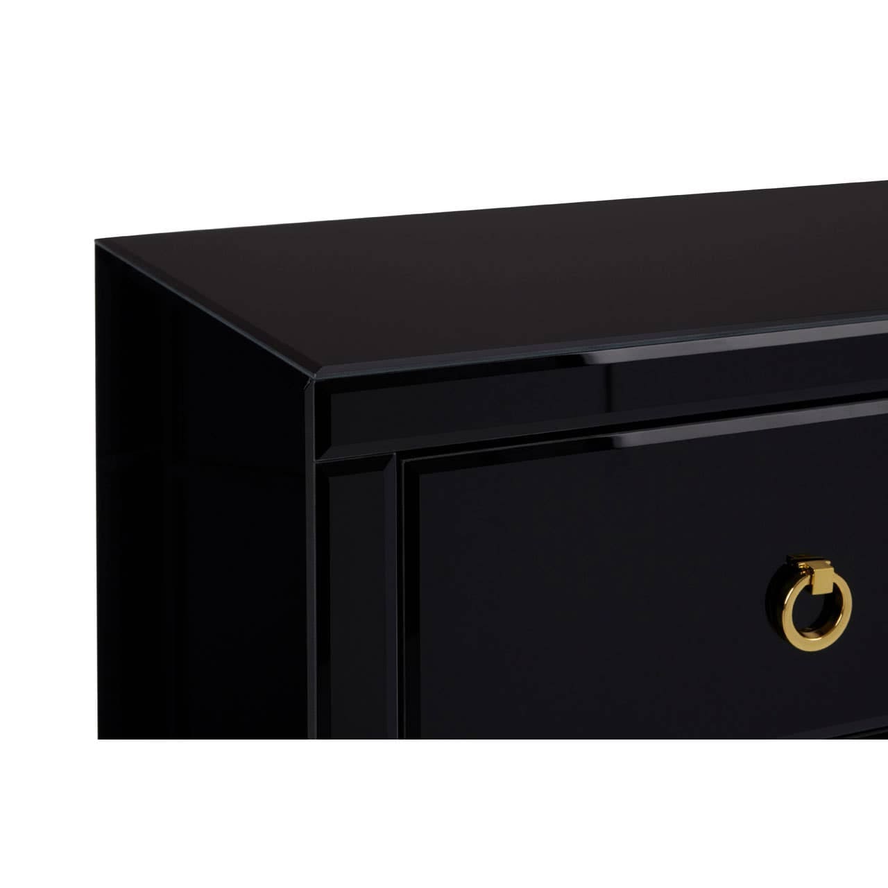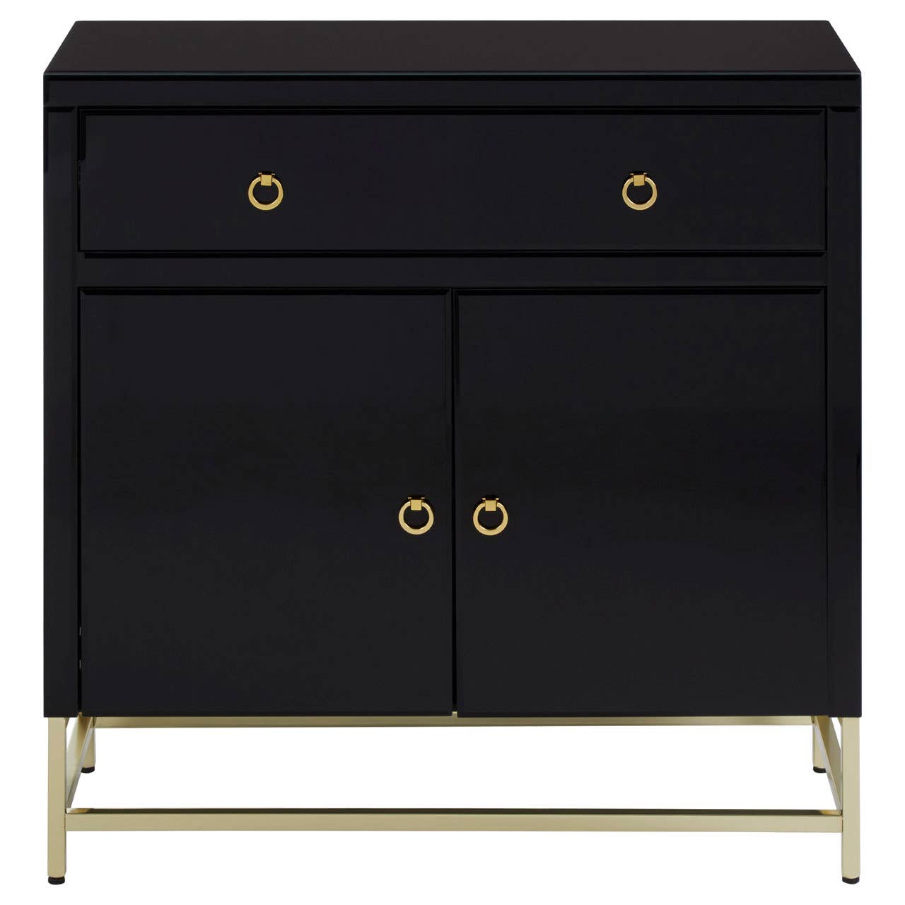 The Kensington Townhouse cabinet is a luxurious statement piece. Its reflective gold coloured frame is made from stainless steel, and supports a sleek black cabinet. The cabinet has a large sliding drawer at the top, while a pair of doors below open to reveal a single shelf. Gold coloured handles contrast with the black finish.