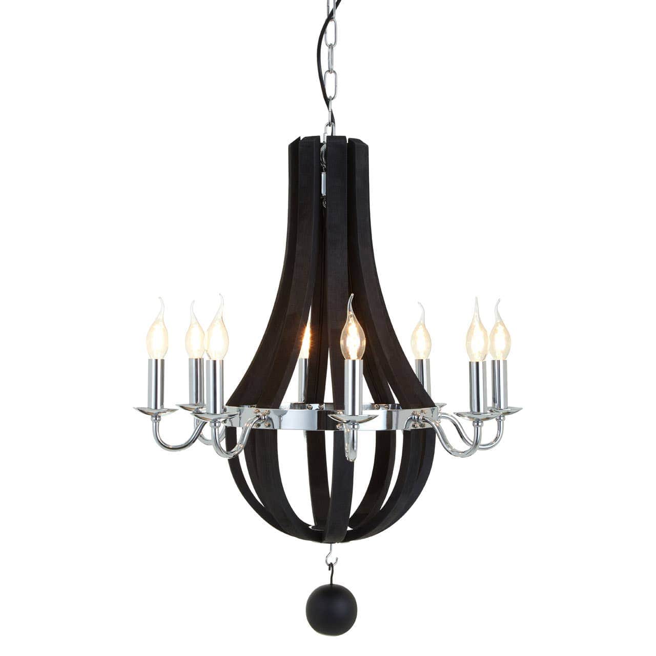 Its body is formed from a series of lateral strips made from sustainable eucalyptus wood. The sleek black finish counterpoints the silver iron band that clasps its circumference. Eight curving arms emerge from the band, each one supporting a cylindrical mount which holds a waved glass shade. A black wooden orb hangs beneath the body, corresponding with the body's rounded shape.