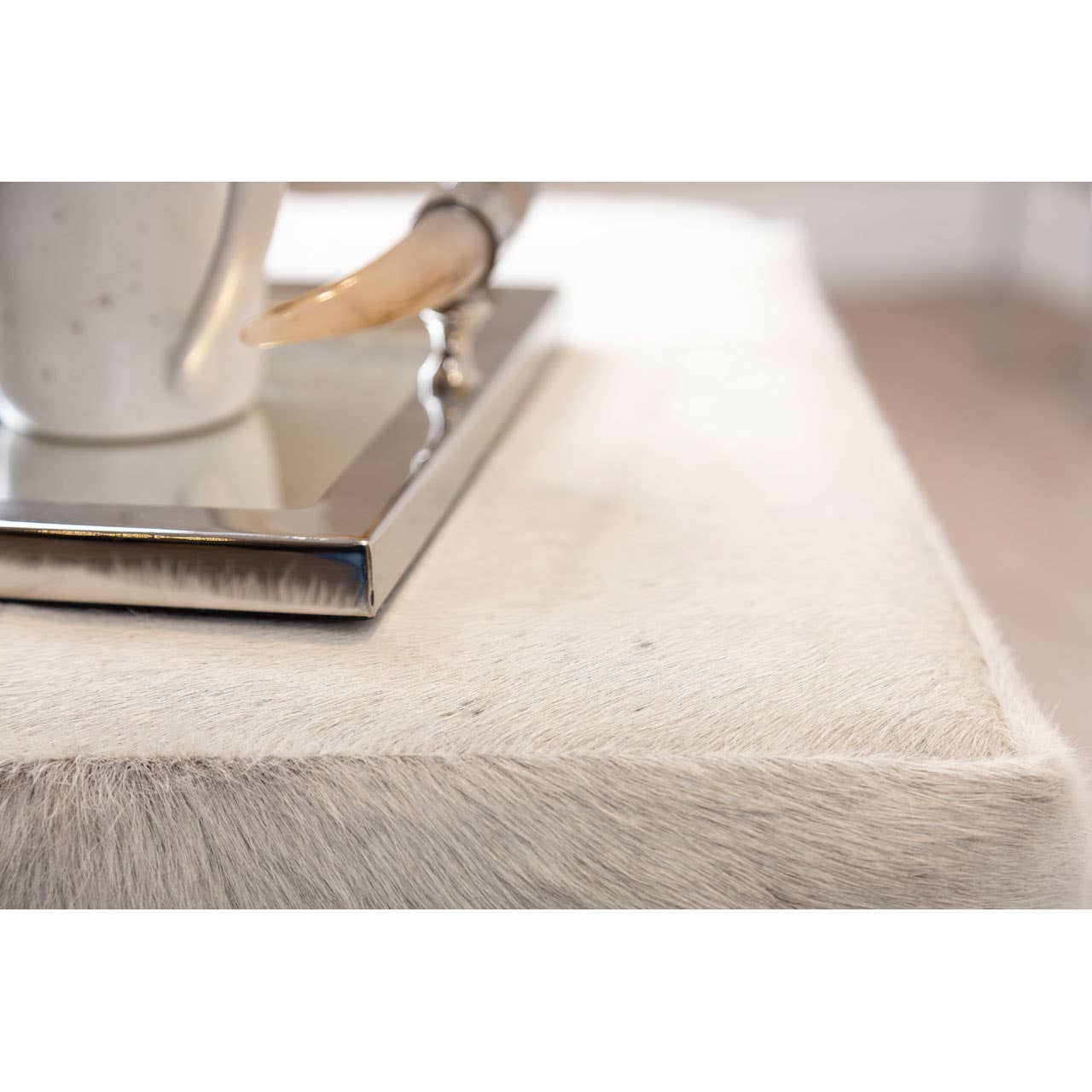 The thick seat of the Kensington Townhouse bench is upholstered with genuine leather for a textured finish. Its white stitched surface produces a subtle grid pattern. The stainless steel frame has a polished look and legs that intersect at the base. Coordinate it with the Kensington Townhouse white leather chair.