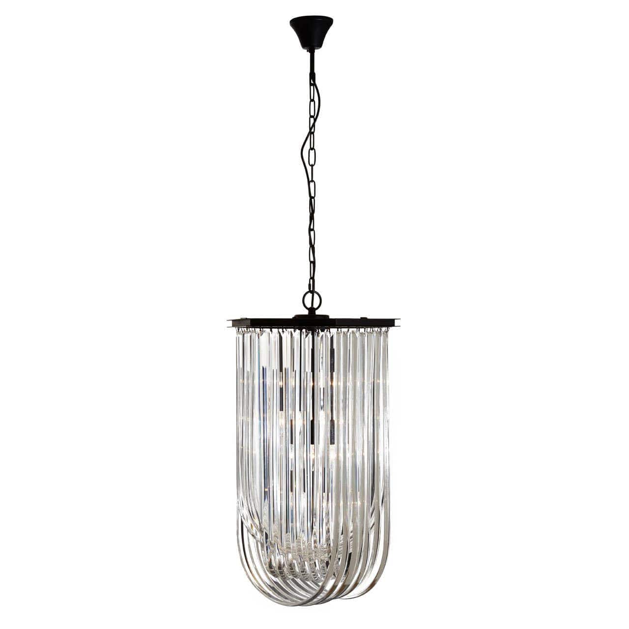 The light's strong iron frame and tough link chain produce a counterpoint to the delicate crystal beneath. The bulbs are partly concealed by the differing lengths of crystal strip, each one curving at the bottom before returning to the frame above. When lit, the crystal will refract the light, creating a beautiful effect which will enhance boutique hotel-inspired interiors.
