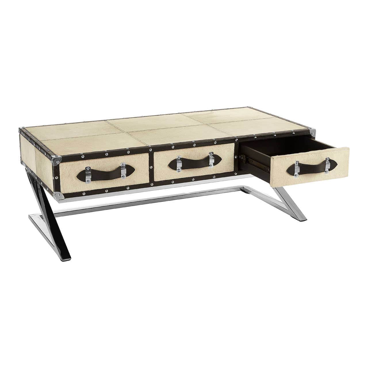 The tabletop is crafted from sustainable mango wood and incorporates three drawers with leather handles into its slim frame. The natural coloured genuine leather is textured and its natural colour is tonally counterpointed by the black leather trim. The trim features metallic stud detail, its reflective finish complementing the z-shaped stainless steel legs.