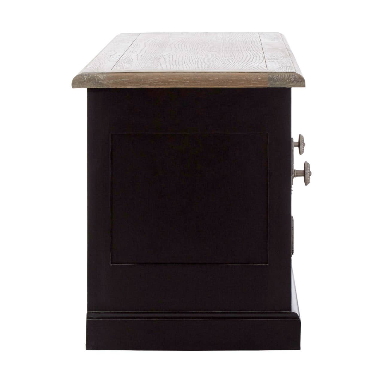 Its central section is comprised of two open shelves, with round openings at the rear that allow AV cabling to be neatly collected. At either side, oak wood doors conceal shelved storage space, each one embellished with a strong carved metal handle. The doors coordinate with the unit's oak wood top, its rich grain adding texture to this distinctive piece.