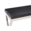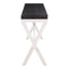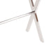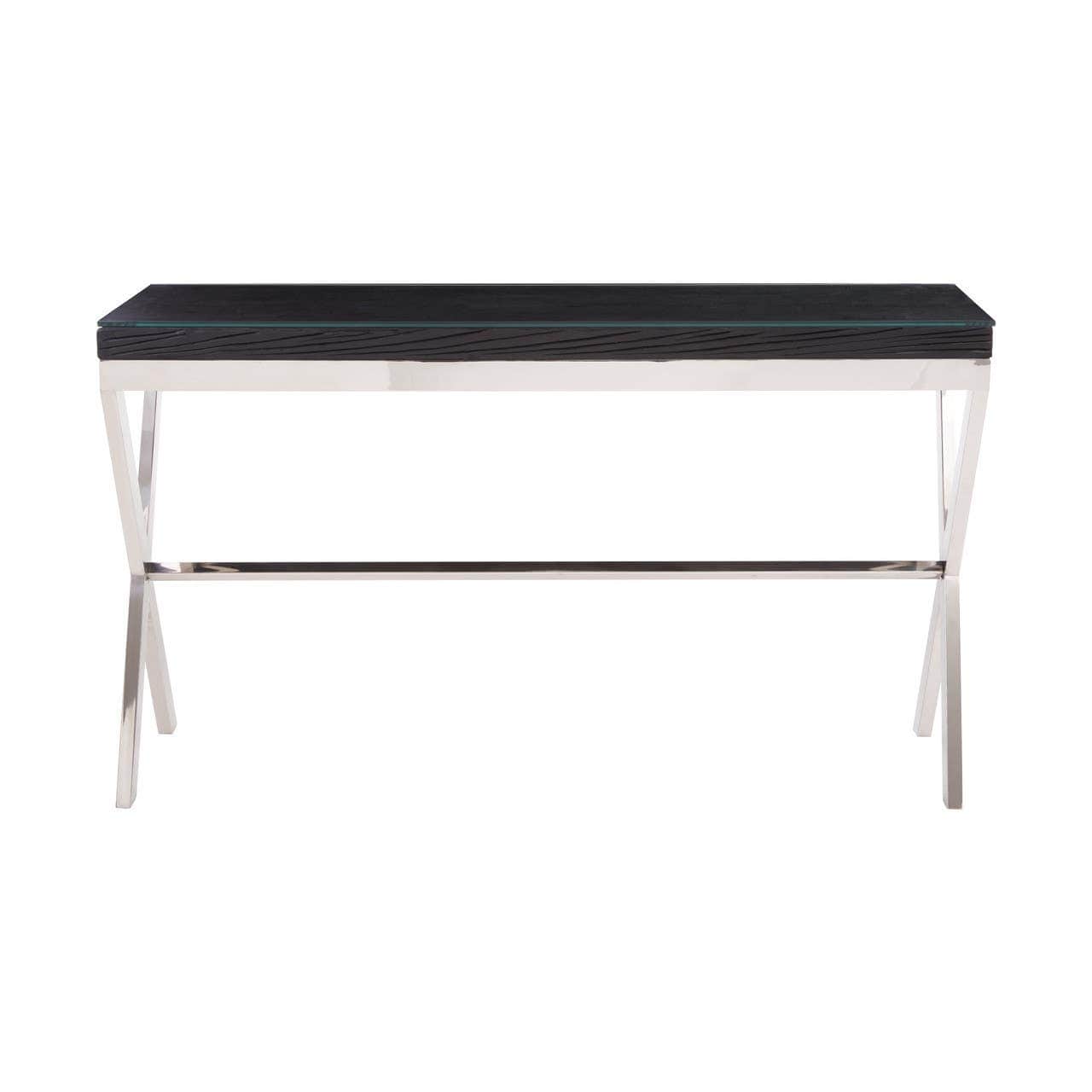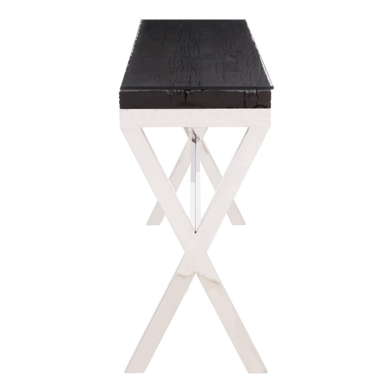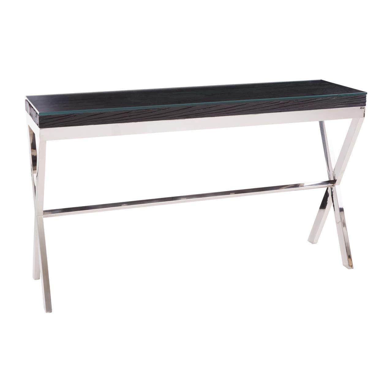 This console table has a silver stainless steel frame with crossed legs to provide stability. The frame combines with a black natural wood top with glass, creating an elegant look suited for showcasing luxe items.