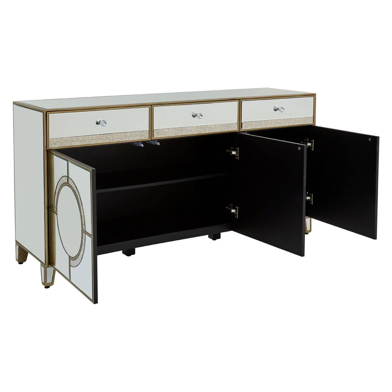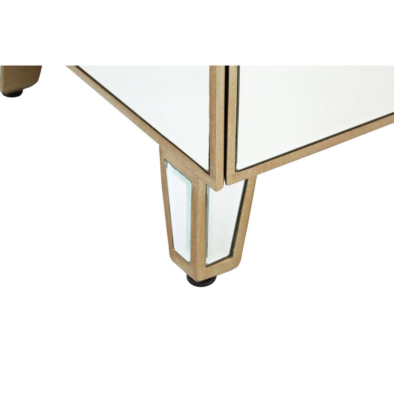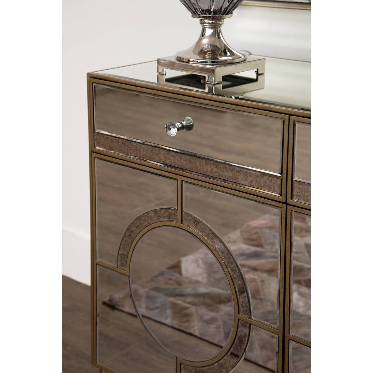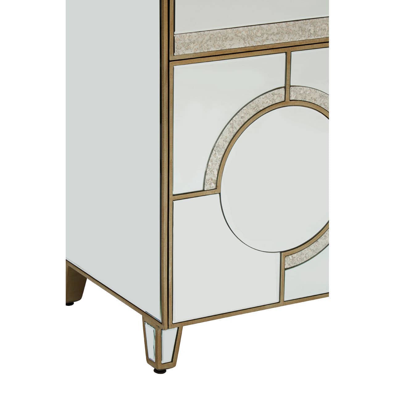 Created from mirrored glass panels, the luxurious cabinet's body coordinates with the faceted, clear crystal-style knobs that embellish each drawer. Antique finished mirrored glass motifs add a decorative element to the fa?ade of each drawer and door.