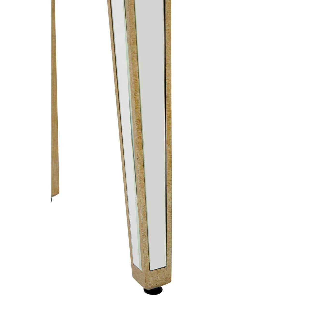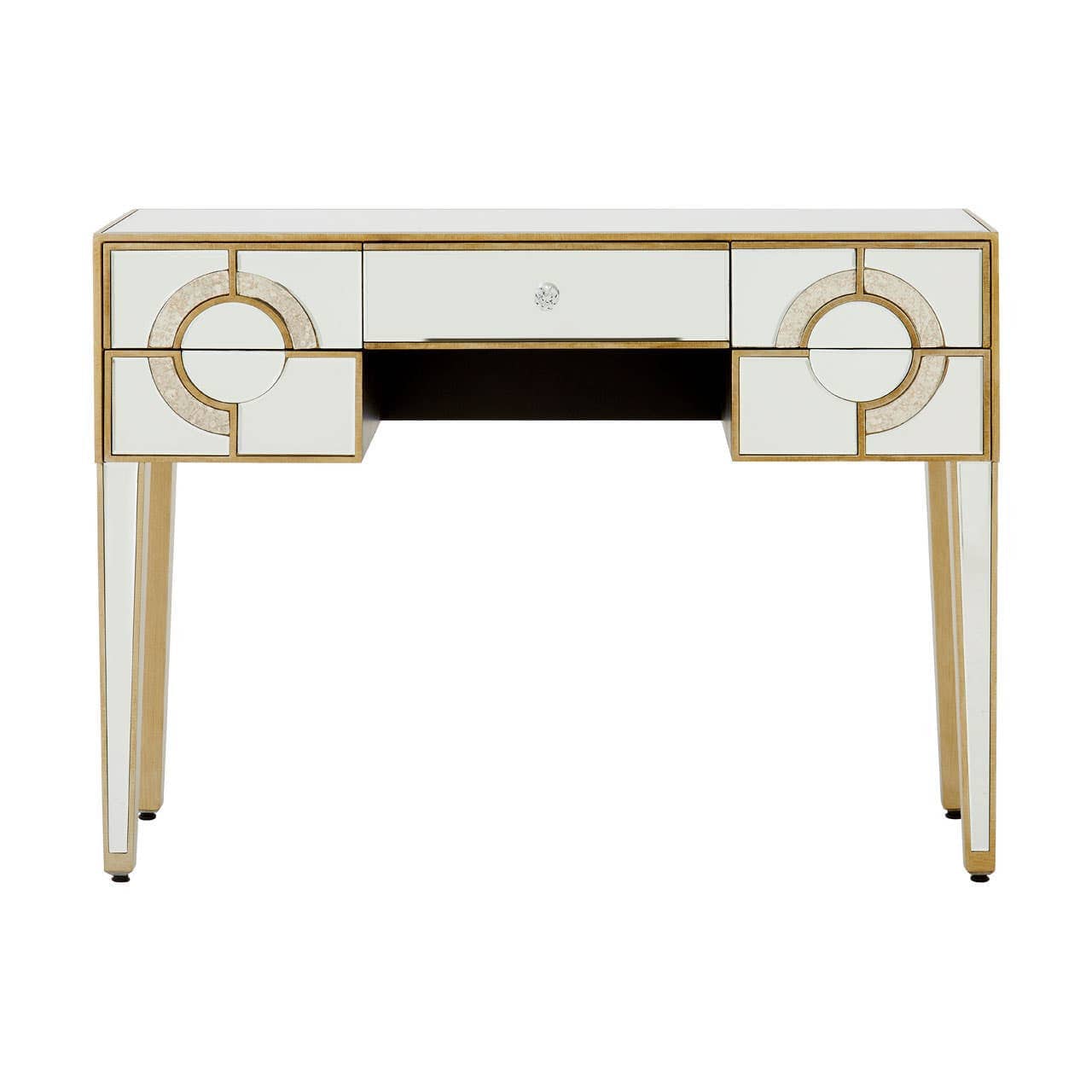 One central drawer features a faceted, crystal-style knob, enhancing the elegance of the table. Two discreet drawers at each side are embellished by a segmented circle motif, with antique finish mirrored glass adding a textural counterpoint.
