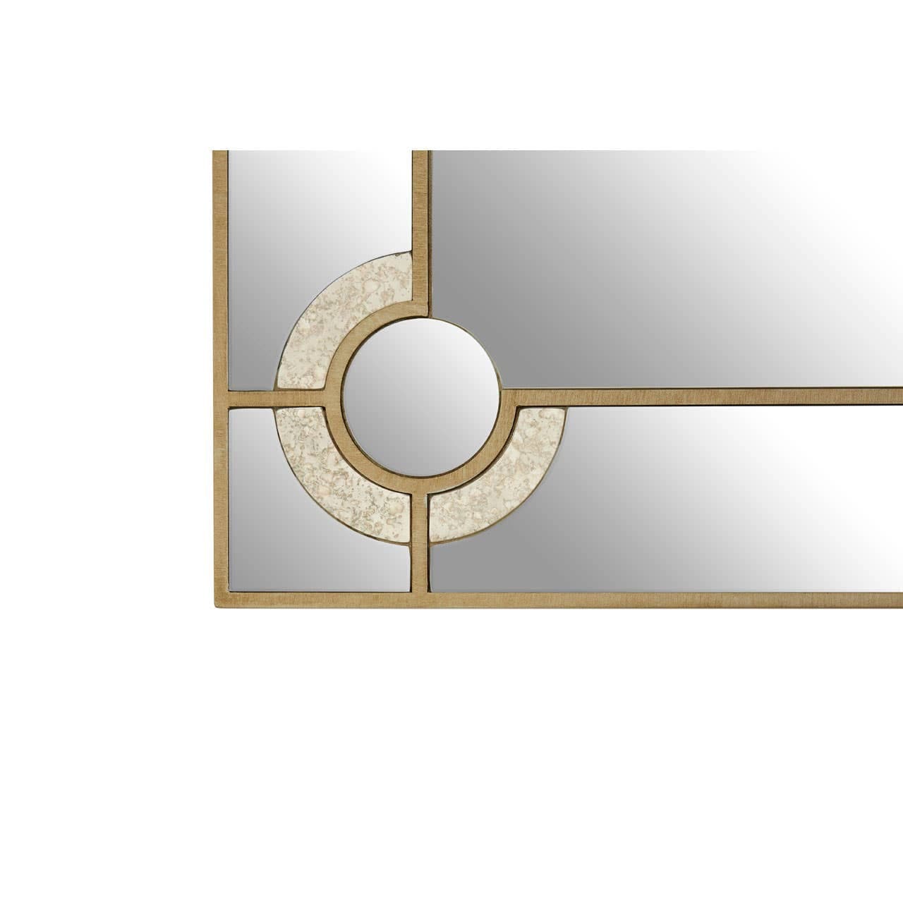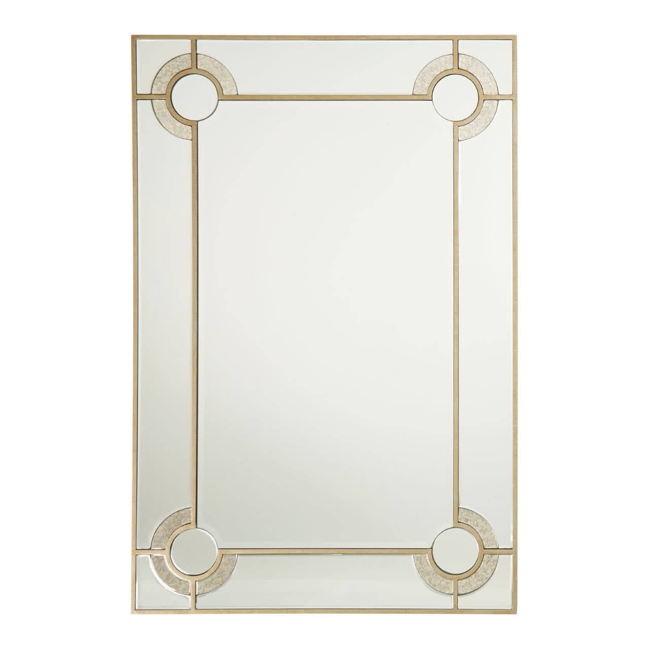 The Knightsbridge wall mirror's dual lined frame in minimal accent contributes to its sophistication. A circular detail featuring a rich texture in matching tones on each corner gives it a decorative touch.