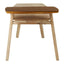 The table is crafted from solid elm wood and his a light grey finish that allows its prominent grain to take centre stage. A small square platform is raised above the long rectangular tabletop, adding a touch more display space. Finished in a rich gold colour, it introduces a warm contrast to the pale wood tones.
