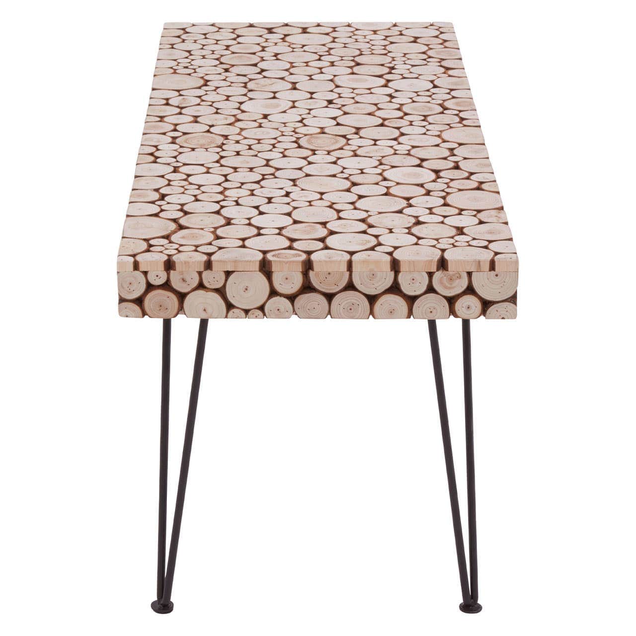 Crafted from FIR wood, this coffee table features a series of hand cut discs that join to create a rectangular design. The quirky top elates rustic accent and sophistication, supported with hairpin legs for stability.