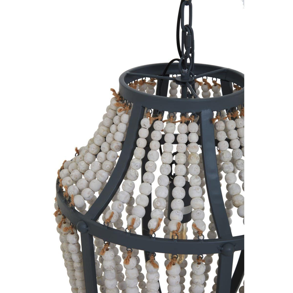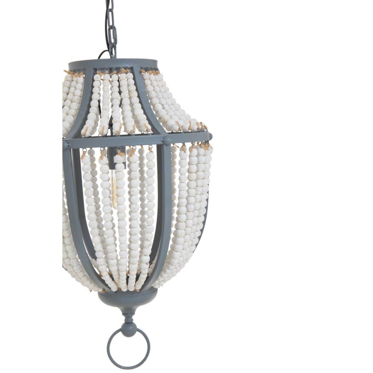 Artfully crafted from wooden beads strung around a grey finish round iron fixture, this chandelier forms a basket drop shape. The cascading strands in white finish illuminate the environment with their smooth structure and bohemian essence.