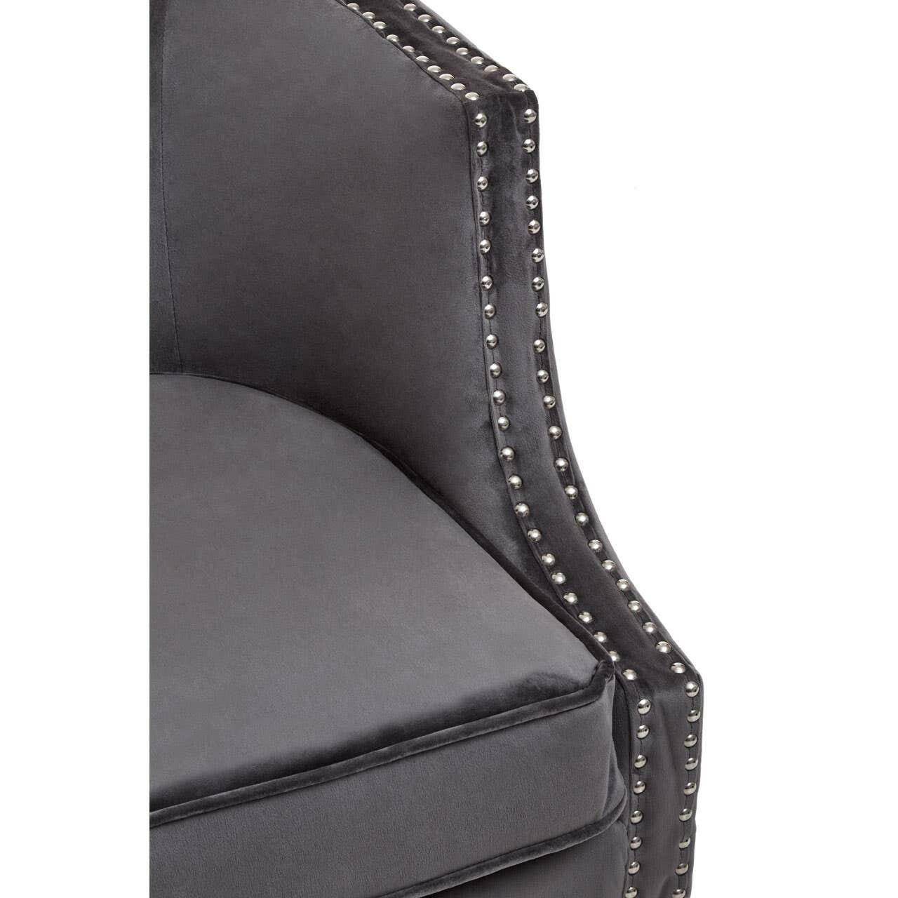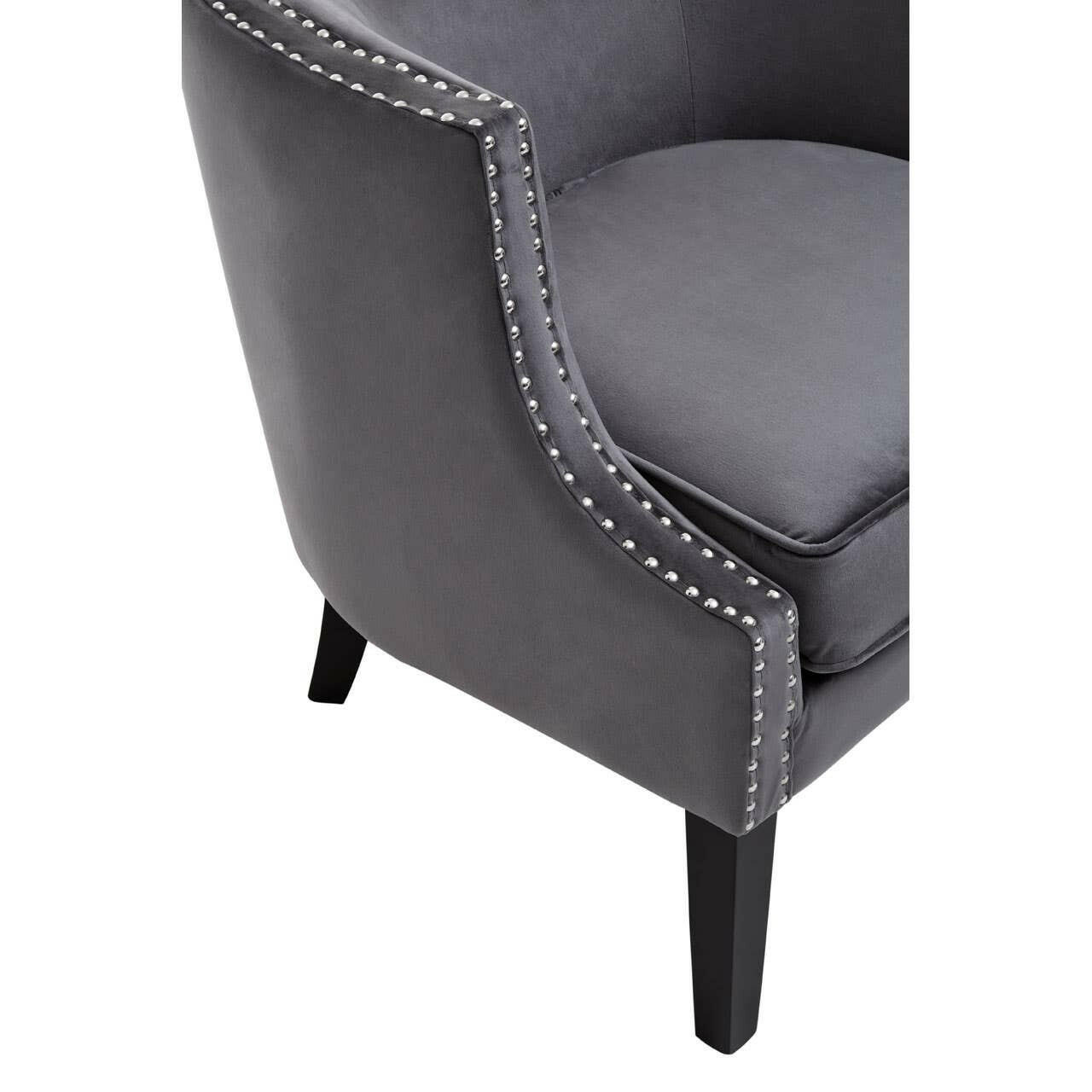 This densely foam-padded chair exhibits gliding armrests with studded detail. Upholstered in sumptuous grey velvet, this chair boasts clean-lined stitching and sits atop a black rubberwood base which adds support with style.
