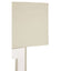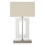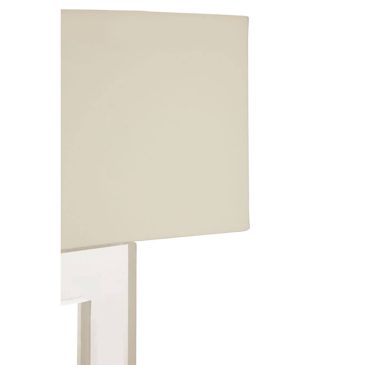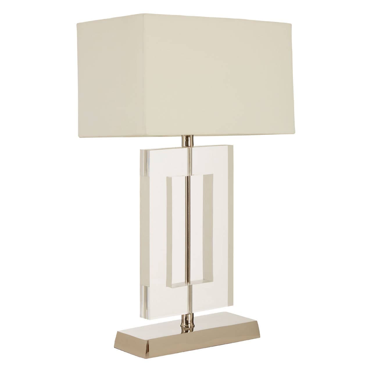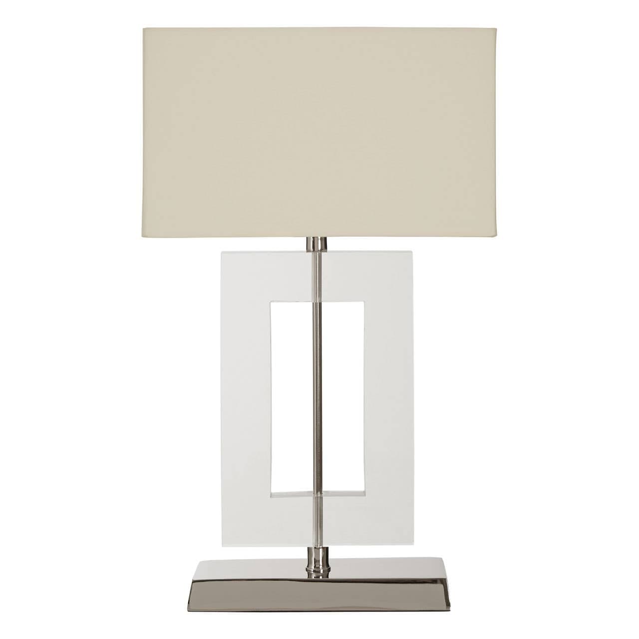 The sleek stainless steel base supports a square body formed from clear acrylic. Its beige coloured fabric shade complements the tones, and softens the light.