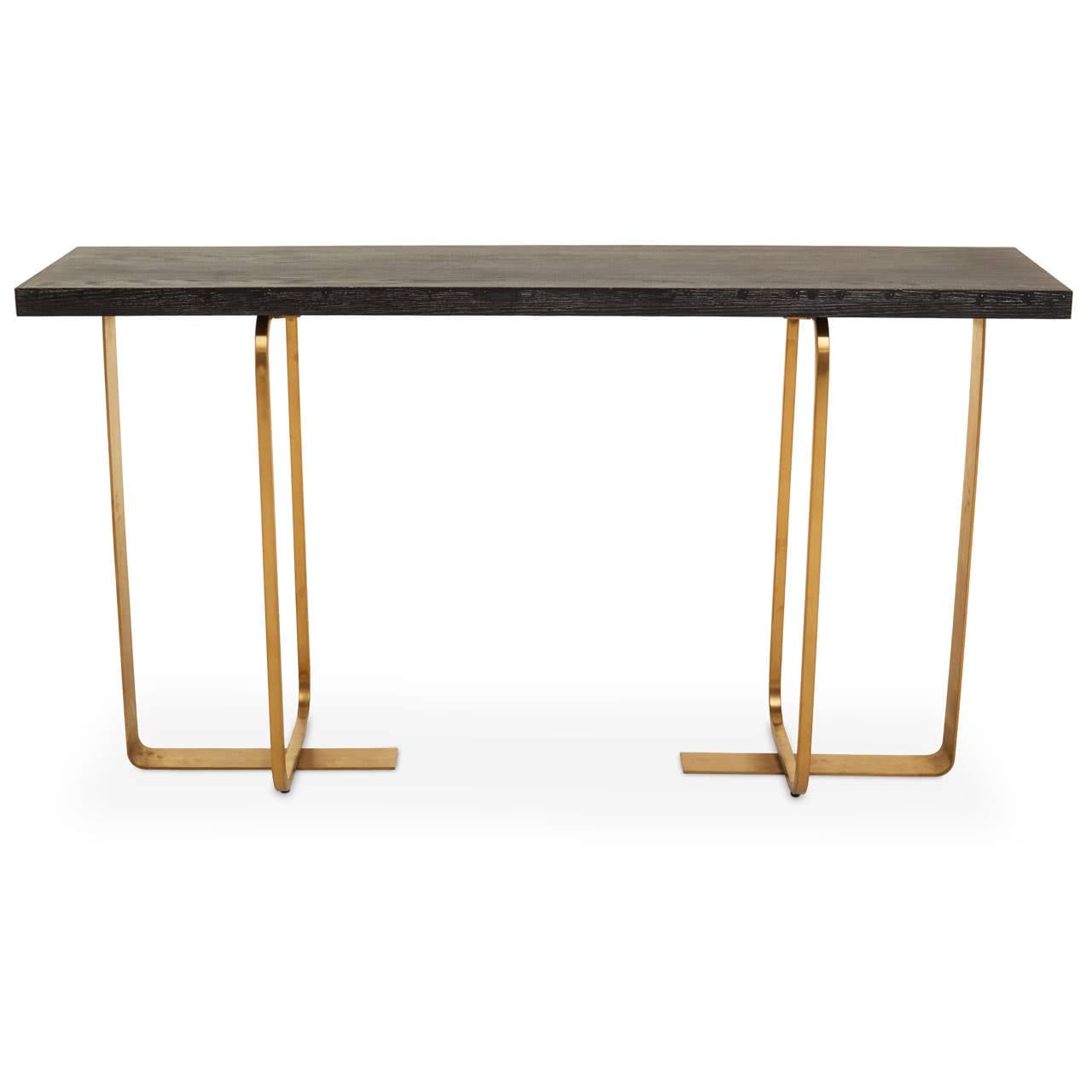 This console table goes well with subtly-industrial spaces. The oak veneered top in a sandblasted black and grey finish features a rectangular shape, creating a rustic charm. The stainless steel base in the gold finish provides added support with style.