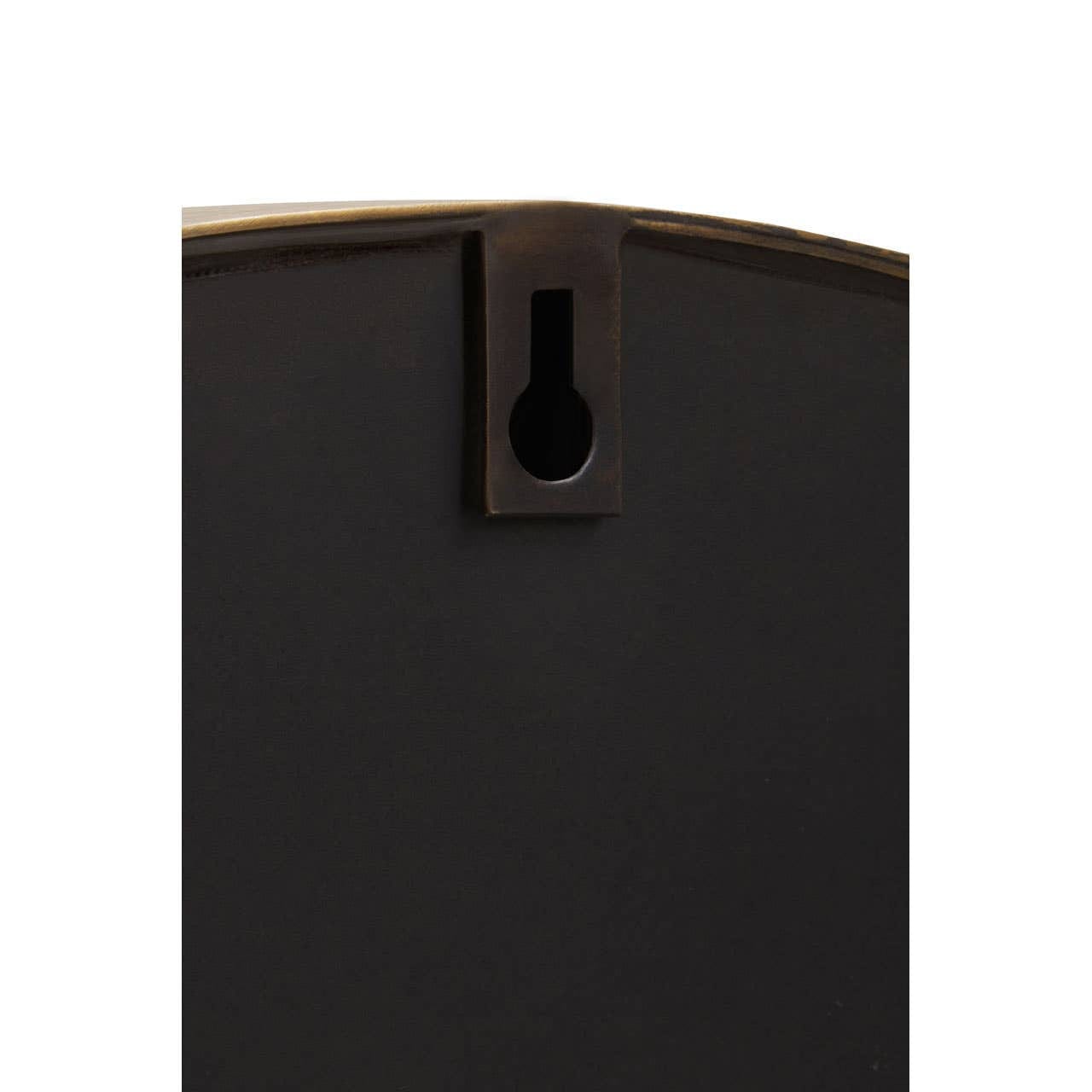 This medium wall mirror has a round frame with minimal lines. The mirror is inset in a sleek stainless steel frame adorned with a gold finish and hammered effect.