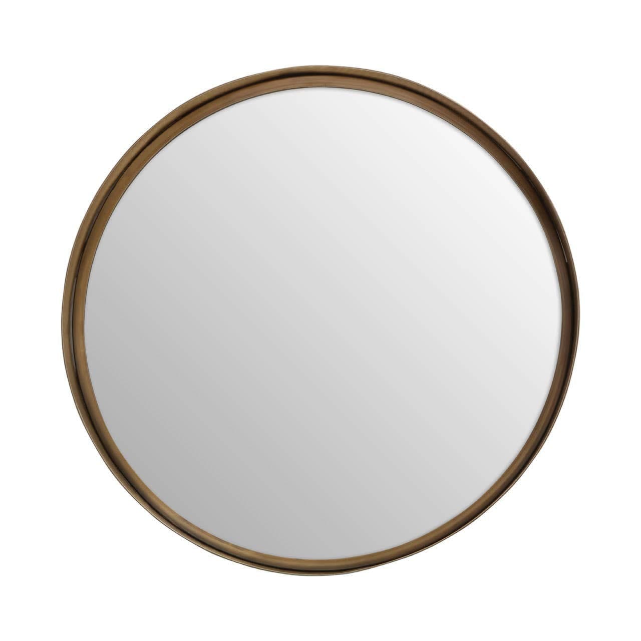This small wall mirror has a round frame with minimal lines. The mirror is inset in a sleek stainless steel frame adorned with a gold finish and hammered effect.