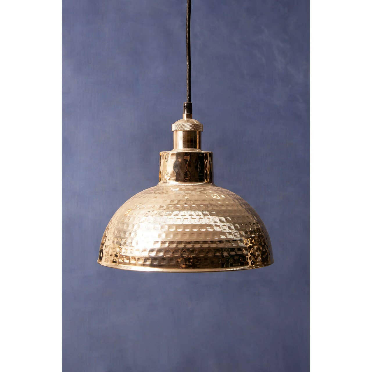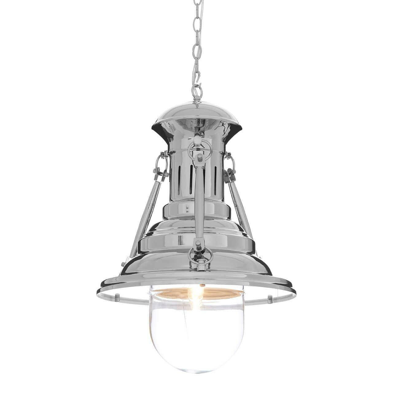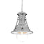The Lexington pendant light can be used as a reflective accent piece for industrial furniture. A large ventilation cap with rounded finial elongates its aesthetic while metal rods, attached with hoops, descent from the cap to the light's wide rim. The bulb is encased in dome shaped glass that complements the iron's sleek chrome finish.