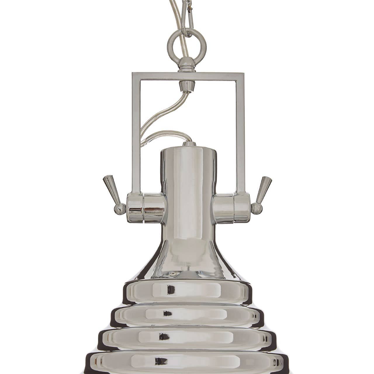 Made from tough iron, this pendant light has a reflective chrome finish that can be coordinated with silver and gold coloured accessories. It's suspended from the ceiling by a thick iron chain, and the shade flares outwards via a series of rounded stepped layers. Small screws extend from its rim to secure the glass base.