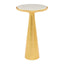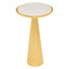 A unique design piece; the small Lino side table feels seamless, with a conical base that tapers gently upwards to hold the table's round top. The distinctive base is finished in a rich golden tone to contrast with the table's light top. A slab of clean white marble forms the table's surface, with exquisite grey veining creating a subtle contrast.