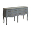 The cabinet of this French-inspired chest is made from natural bayur wood, and has a muted grey finish that contrasts with the richly grained top section. Four drawers with ornate baroque handles are integrated into the cabinet. Panelled detailing at the sides and back and carved legs add further to its chic presence.