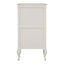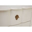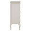 The Loire chest features five drawers, each one adorned with a baroque-style handle. These handles complement the chest's carved detail, from the curving feet to the undulating base. It's made from natural bayur wood, slightly coarse in texture for a tactile finish. The white colour features distressing to give it an antique look.
