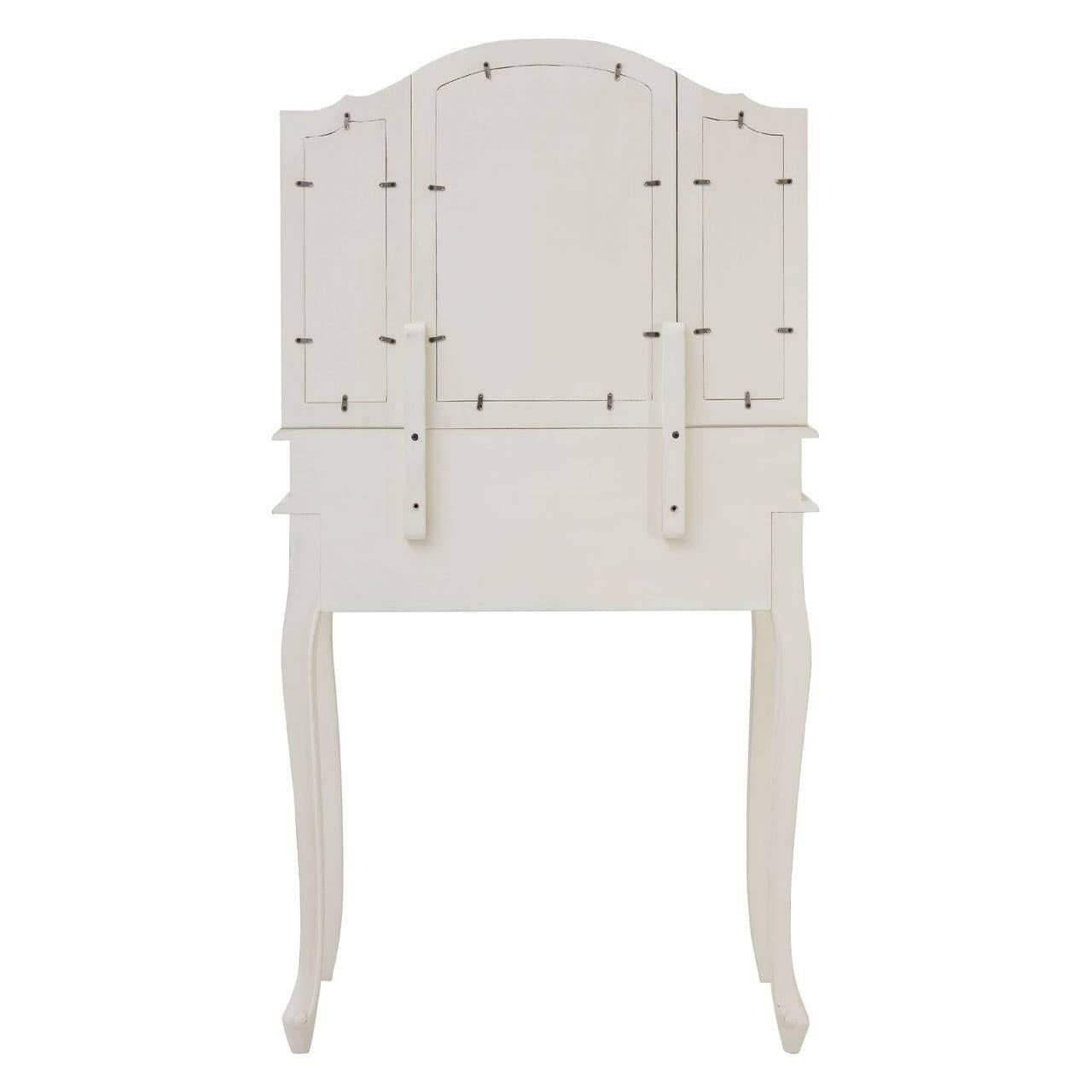 The Loire dressing table is formed from bayur wood and features carved legs and an undulating apron. The wood is coloured a crisp white and features subtle weathering that accentuates its curves. Ornate brass coloured metalwork adorns its storage drawers. Its three panel mirror can be adjusted at the sides.