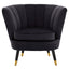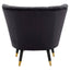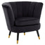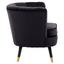 This chair features vertical channel tufting on its barrel design back upholstered in plush black velvet. The black wooden legs with gold finish tips add to the luxe aesthetic.