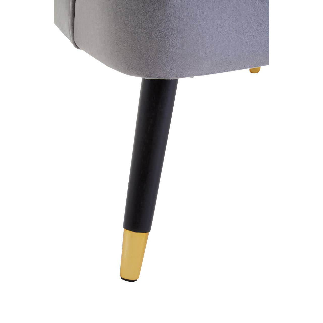 The Loretta armchair creates a sleek aesthetic. It is upholstered in grey velvet which is complemented by sturdy black legs which have a luxe gold tip at the end.
