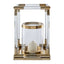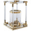 The Lucita lantern is a sleek combination of gold finish steel and clear acrylic. Housed inside the lantern is a cylindrical holder made from clear glass, with a reflective steel trim at the top and bottom.