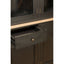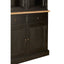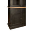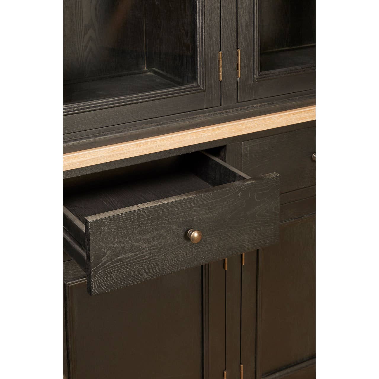 The stately piece boasts a deep black finish with contrasting whitewash trim and top, adding to the cabinet's visual intrigue. Inspired by traditional colonial design, the cabinet boasts an array of shelves, as well as two spacious cupboards and four drawers. Intricate metallic handles and simple carved detailing add decorative flares to this bold design piece.