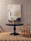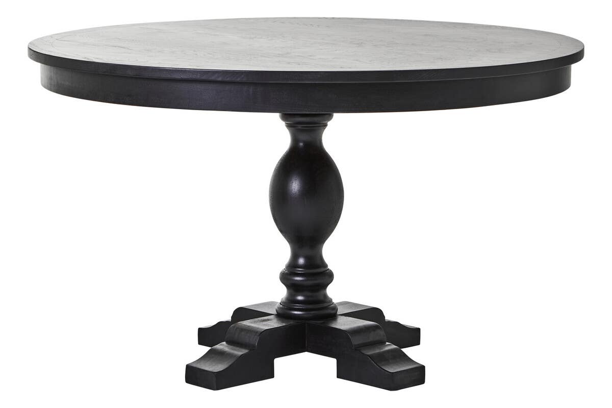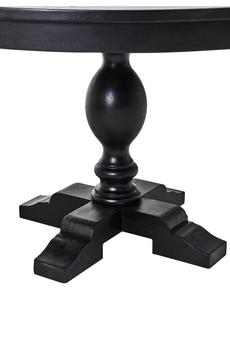 The Lyon table has a round form with an empire style carved base. The table is supported by a strong pedestal. It has a rich matte black finish which enhances the antique charm of the table. It goes well with classic or farmhouse style interiors.